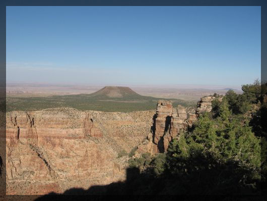 Wir verlassen Flagstaff und fahren auf der US 180 in Richtung des Grand Canyons nach Norden. Zuerst kommen wir wieder durch eine sehr skandinavisch anmutende Hochebene mit vielen Bäumen, nach einiger Zeit verliert die Straße aber allmählich an Höhe, und die Fauna wird spärlicher. Grün ist es aber immer noch, insgesamt erinnert die Kombination aus roter Erde mit sattgrünen Pflanzen Katharina an Australien. Wir haben uns Arizona auf jeden Fall wesentlich karger vorgestellt.