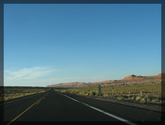 Echo Cliffs am SpätnachmittagKurz vor Page führt die Straße zunächst steil bergauf, über einen Tafelberg hinweg und dann tief eingeschnitten wieder bergab. Unser Tank ist inzwischen ziemlich leer, und Dirk ist froh, den Wagen rollen lassen zu können. Als wir Page und damit glücklicherweise auch eine Tankstelle erreichen, ist die Tankanzeige unter sämtlichen Warnstrichen angelangt und der Bordcomputer weigert sich, Prognosen über die noch zu fahrende Reststrecke abzugeben. Nachdem wir getankt und im Motel eingecheckt haben, gehen wir im Taco Bell Abend essen und treffen dabei wieder auf Landsleute. Das junge Pärchen hat scheinbar gerade seine Südwest-Tour begonnen, kommt noch nicht mit dem Bestellprozedere in amerikanischen Fast-Food-Lokalen zurecht. Letztendlich bestellt auch noch jeder der beiden ein "Menu". Ein Glück, dass die Bedienung versteht, was gemeint ist und nicht den Akkuschrauber holt, um die Menütafel über dem Tresen abzumontieren. Auf dem Rückweg zum Motel sehen wir an einer Stelle sechs oder sieben Kirchen direkt nebeneinander. Eine Kirche pro 1000 Einwohner, das ist mal echt ein gutes Verhältnis.