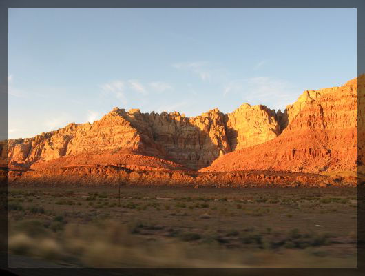 Blick vom Watchtower nach NordostenWir verlassen den Nationalpark mit noch etwas Benzin im Tank und fahren auf der US 64 in Richtung Cameron. Die Straße fällt steil ab und die zunächst dicht bewaldete Landschaft macht wieder einer Steppe Platz. In Cameron biegen wir auf die US 89 nach Page ab. Die Strecke führt an interessanten roten Felsformationen vorbei, die im Licht der immer tiefer sinkenden und schließlich untergehenden Sonne eine intensive Färbung annehmen. Die Anzahl der Tankstellen auf diesen Streckenabschnitt kann man als überschaubar bezeichnen, so dass sich der Tank unseres Autos langsam aber stetig immer weiter leert.