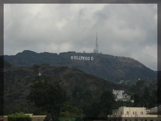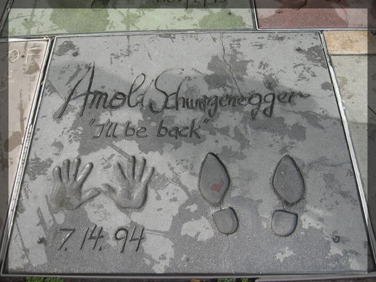 Hollywood-Zeichen vom Hollywood&Highland Center aus gesehenEbenfalls in das Ensemble des Hollywood&Highland Center integriert ist das Kodak Theater. Dieses Veranstaltungszentrum wurde im November 2001 eröffnet, seit 2002 werden hier jährlich die Oscars vergeben. Wir bewundern noch mal den Eingangsbereich und laufen dann nur einige Meter weiter zum Sid Graumans Chinese Theater. Das Äußere dieses 1927 erbauten Kinos ist komplett im chinesischen Design gehalten. Der Platz vor dem Gebäude ist mit den berühmten Betonplatten gepflastert, in denen berühmte Schauspieler ihre Hand- und Fußabdrücke hinterlassen haben. Das geht los bei Douglas Fairbanks und Charlie Chaplin und endet bei den drei Hauptdarstellern der Harry Potter-Filme. Wer - wie beispielsweise der kleine R2D2 aus Star Wars - keine Hände oder Füße im eigentlichen Sinne hat, drückt stattdessen einfach seine Räder in den weichen Beton. Wir vergleichen die Größe unserer Hände mit denen der Stars und kommen zu dem Schluss, dass Dirks Hände ziemlich genau denen von Tom Hanks entsprechen.