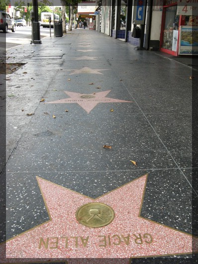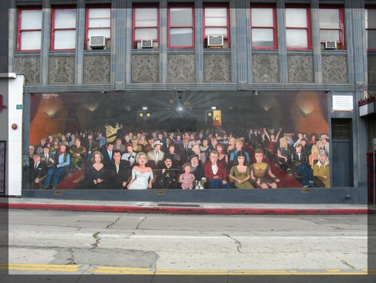 Sterne am Hollywood BoulevardEntlang zahlreicher Sterne laufen wir nun den Hollywood Bouleward nach Osten ab und kommen dabei am bekannten Wandgemälde in der Wilcox Avenue vorbei. Dieses Wandgemälde vertauscht die Rollen von Kinopublikum und Schauspielern, indem ein Kinosaal gezeigt wird, aus dem Größen wie Marylin Monroe, Clark Gable, Humphrey Bogart und viele mehr erwartungsfroh auf die Leinwand schauen. Wir entdecken auch ET, der den Kinosaal verlassen hat und eines der Telefone in der Halle benutzt, um nach Hause zu telefonieren.