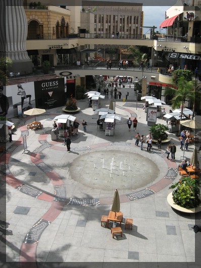 21.9.2007: Los AngelesDa wir nur den Vormittag zur Verfügung haben, stehen wir relativ früh auf. Wir haben uns ja bereits vor zwei Tagen abends etwas in Hollywood umgeschaut, nun nehmen wir uns etwas mehr Zeit dafür. Direkt neben dem Hotel liegt das Hollywood&Highland Center, ein modernes Einkaufszentrum mit schönem offenen Innenhof. Der Innenhof ist geprägt von einer lustigen Brunneninstallation sowie einen aus Mosaiksteinen gebildeten, in den Boden eingelassenen roten Teppich. Dieser Teppich verläuft auf ziemlich verschlungenen Wegen und soll so den schwierigen Weg von noch unbekannten Schauspielern und Regisseuren nach Hollywood und zum Erfolg symbolisieren. Alle paar Meter ist in den Teppich die Geschichte eines berühmten Filmschaffenden eingelassen, aber anonym. Darunter ist zum Beispiel eine Sekretärin, die von ihrem Chef entlassen wurde, weil sie als Sektetärin nicht geeignet sei. Daraufhin hat sie mit der Schauspielerei begonnen...