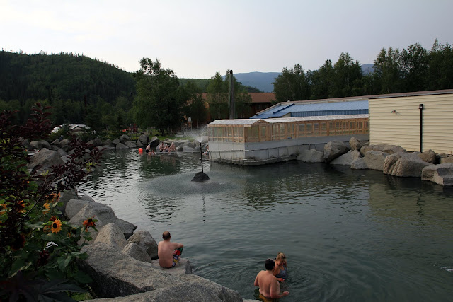 Und jetzt kommen wir zu Badehose. Nur 60 Meilen von Fairbanks entfernt gibt es die heißen Quellen von Chena Hot Springs. Das liegt zwar nicht wirklich auf dem Weg, da wir diese Stichstraße auch wieder zurück müssen, aber es klang zumindest interessant. Kaum dort angekommen stürzten wir uns auch sofort in die "heißen" Fluten.