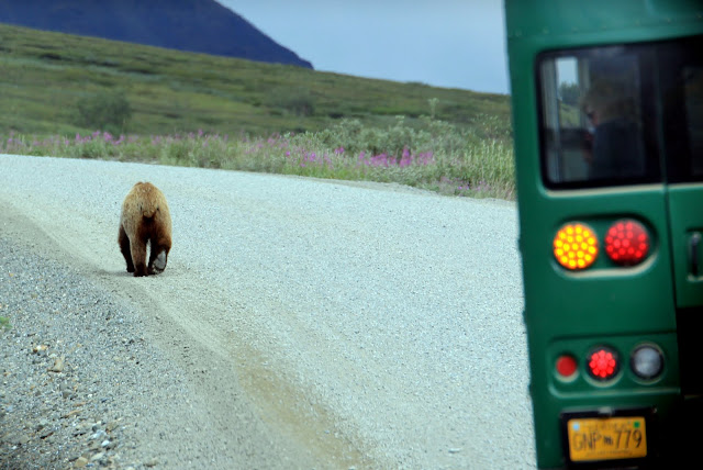 Neben diesem überwältigenden Bergpanorama wusste auch die Tierwelt auf sich aufmerksam zu machen. Zwar waren die Tiersichtungen nicht ganz so zahlreich und abwechslungsreich wie erhofft, wir wollen uns aber dennoch nicht beschweren. Immerhin kreuzten unzählige Caríbous , 2-3 Elche und 3 Grizzleys unseren Weg. 2 der Bären waren sogar relativ nah und nur ca. 30 Meter entfernt. Der Busfahrer erinnerte uns immer wieder daran keine Körperteile aus dem Bus zu strecken.