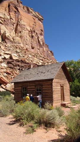 Der Rundweg ist nicht besonders lang und am Anfang zweigt noch ein weiterer Wanderweg der Rim Trail ab, ein paar Meter gehen wir diesen Weg zusammen aber ich bin heute einfach nicht fit, ich lasse mich am Wegrand nieder, es ist mittlerweile angenehm warm und lasse meinen Freund allein weitermarschieren. Hier könnte ich stundenlang hocken und den Blick in die Landschaft genießen. In der ganzen Zeit kommt kein Mensch vorbei! Irgendwann ist mein Freund zurück, ich bin immer noch müde, längere Wanderungen kommen heute nicht mehr in Frage. Stattdessen besichtigen wir den historischen Ort Fruita mitten im Park, er erinnert ein bisschen an ein Heimatmuseum aber in welch einer Kulisse!