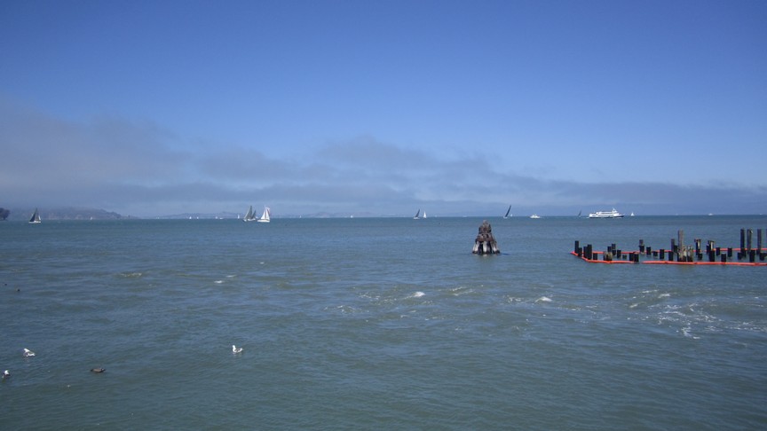 War ein Erlebnis die erste Fahrt damit und hat uns auch jedes weitere Mal Spaß gemacht. An der Endstation angekommen sind wir zuerst mal einfach nur was rumspaziert und haben die Atmosphäre auf uns wirken lassen, einen ersten Eindruck der Bay, der Fisherman´s Warf und des Piers 39 gesammelt. Wetter war hier total schön und warm, der Nebel hing weiter draußen fest anscheinend.