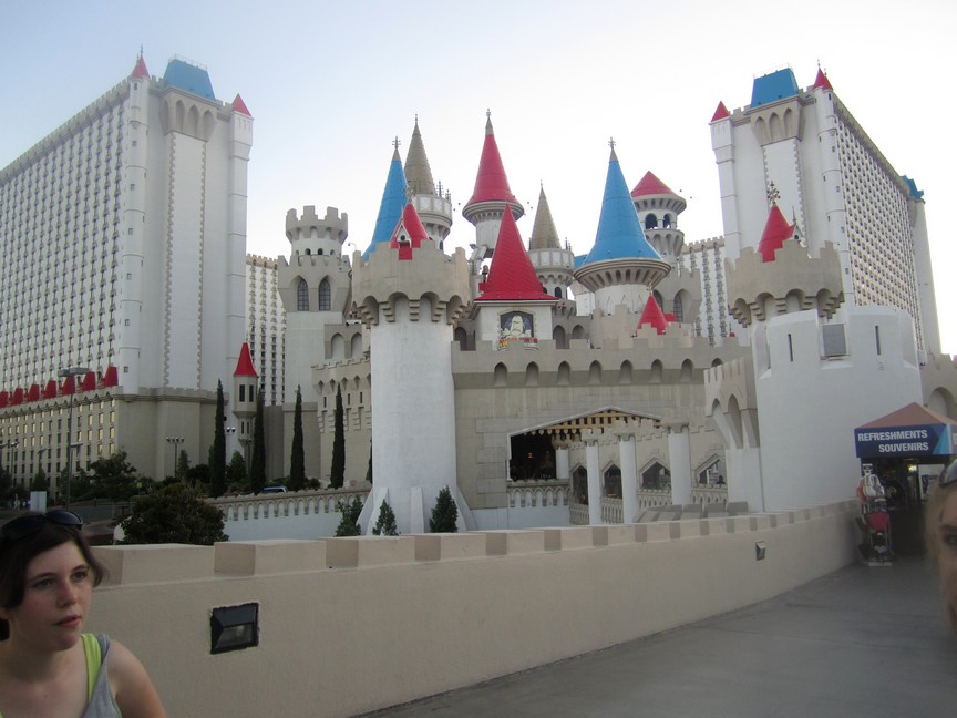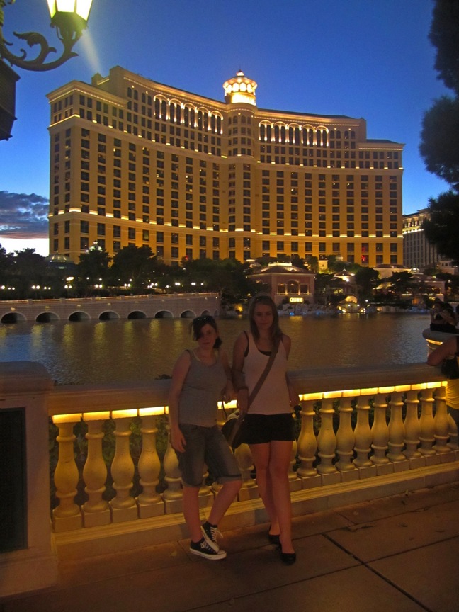 Wir haben uns dann noch jeder ein leckeres Eis gegönnt bevor wir ins Hotel zurückfuhren und unseren Escape wieder ins Parkhaus stellten. Da es recht heiss war beschlossen wir die großzügige Pool-Landschaft mal näher anzuschauen und uns etwas abzukühlen. Für den Abend hatten wir uns vorgenommen die „Sirens of Ti“ anzuschauen, wir fuhren mit dem Taxi zum Treasure Island und wollten dann zu Fuß zurück zum Luxor über den abendlichen Strip wandern. Allerdings hatten wir zu knapp kalkuliert und kamen zu spät an und es war kein winziges Plätzchen mehr frei wo man noch was hätte sehen können. Also heut dann eben nicht, morgen sind wir ja auch noch hier. Ersatzweise haben wir uns dann die Wasserspiele vorm Bellagio angeschaut, hat uns allen sehr sehr gut gefallen und ist abends noch ne Ecke schöner als tagsüber. Nachdem wir dann noch in diversen Hotels auf dem Weg uns die Innenarchitektur angeschaut haben (Bellagio, New York und Excalibur zB) taten mir (und ich glaube auch Laura und Lisa) dann so langsam ziemlich die Füße weh und wir waren froh dann so gegen halb 12 zurück im Zimmer zu sein. Ich hatte es doch tatsächlich geschafft mir 2 Blasen unter den Füßen einzuhandeln, son Mist
