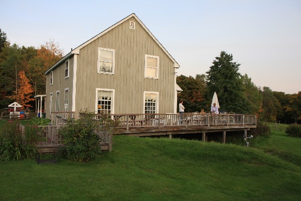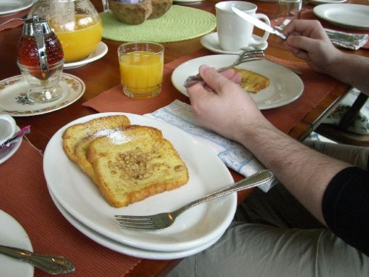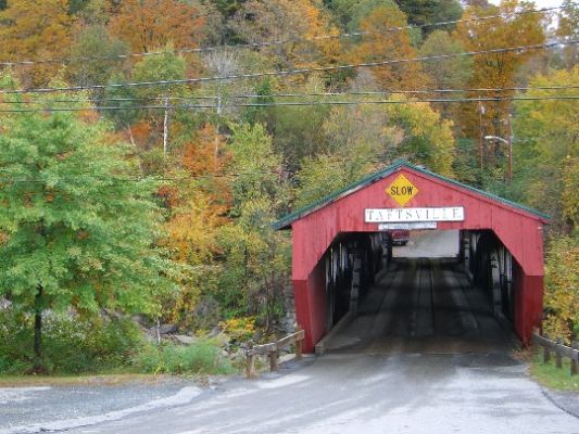 An der Tafel saßen noch 4 weitere Pärchen, alles Amis. Es ist immer ganz schön etwas Smalltalk am Frühstückstisch zu haben, so erfährt man doch einiges über die wahren Amerikaner, ohne hier meine Vorurteile auszuräumen. Sie sind redselig und wissbegierig, stets freundlich, aber in einigen Ansichten sehr „amerikanisch“ (Stromverbrauch, Motorengrößen, politische Meinungen, Waffenrecht etc.). Jedoch sind sie dahin gehend tolerant, dass Sie andere Meinungen auch zulassen, gerade wenn es sich um Ausländer handelt. Aber die Gespräche waren nie besonders tiefgehend, aber ich konnte mein englisch aufpolieren. Dann kam der Frenchtoast mit selbsthergestelltem Maplesirup. Ist ok, aber mir eigentlich zu süß. Man wird satt und hat die Kalorien eines Waldarbeiters schon zum Frühstück verputzt. Es regnet draußen sehr stark, daher sehen wir uns in großer Runde ein Video über die Herstellung des Maplesirups an. Auch ein kleiner Beitrag in einer Sendung über die Innkeeper wird uns gezeigt. Der Regen lässt nach und wir brechen auf in Richtung Battleboro zur Creamery Bridge.