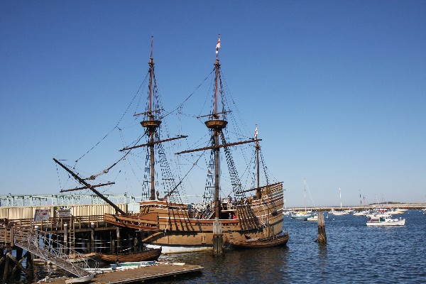 Hier sind feste Häuser, Anbauflächen für Getreide und Gemüse, eine Schmiede, Nutzvieh der Siedler und ein Versammlungsraum/Kirche/Gericht auf einer Anhöhe. Auch hier beantworten Schauspieler Fragen und erklären das damalige Leben. Bei den Schauspielern handelt es sich um Nachkommen der Siedler und Wampanaugs. Wir fahren noch nach Plymouth zur Mayflower II. Von außen ist Sie schon imposant und gut zu fotografieren. Von innen ist es stickig, muffig und feucht. Ich kann sagen, ich hätte die Überfahrt wahrscheinlich nicht überlebt.