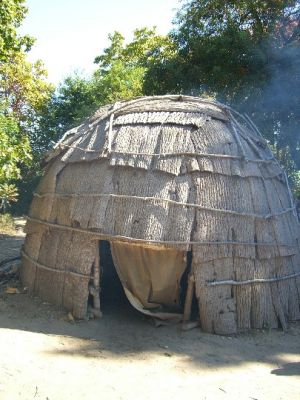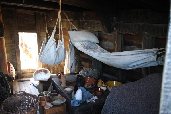 Dort sitzen Schauspieler, die Fragen beantworten und dort auch arbeiten. So brannte einer gerade einen Stamm für den Bau eines Bootes aus und eine Frau kochte Essen. Man kann in die Hütten schauen und geht dann weiter. Dem Pfad entlang gelangt man zum unweit entfernten Dorf der englischen Siedler.
