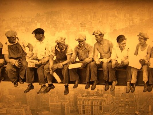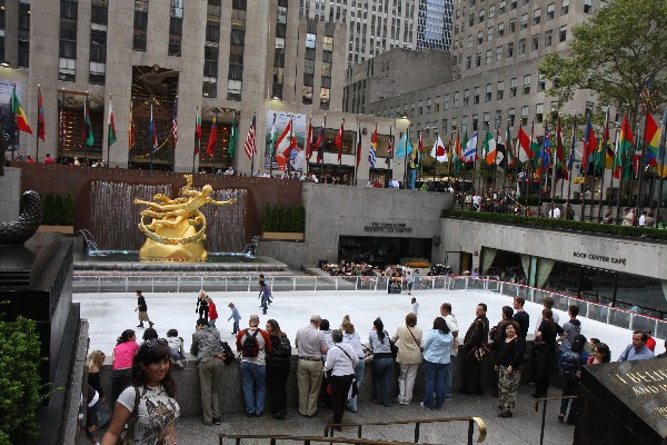 Am Bahnhof angekommen, kaufe ich Tickets zur Grand Central. In 5 min. geht’s los, also nichts wie zum Track und Sitzplatz gesucht. Die Koffer verstauen wir so, dass sie nicht im Weg stehen. Mit 3 großen Koffern ist Zugfahren noch ok, aber mehr würde ich nicht machen. Die Fahrt dauert wieder 1,5 Std. und vor uns sitzt doch eine Deutsche Studentin, die ein Auslandsemester in Yale studiert. Toll, wer so ne Partneruni hat…. Sie fährt mit uns nach New York, ist aber noch unbeholfener als wir. Im Zug wird auch Werbung für einen Trip nach Deutschland gemacht, irgendwie witzig, wenn man in den USA „Come and visit Germany“ liest. Es wird auf die Geschichte vom Fall der Mauer hingewiesen und die stille Revolution und das es auf jeden Fall eine Reise Wert ist. In der 125th Street steigen wir aus. Etwas orientierungslos schauen wir uns um und laufen dann zur Metrostation. Mit der 6 fahren wir Downtown bis zur 103th Street. Nach dem Erklimmen des Hügels sehen wir die Bubba&Bean Lodge, ein typisches New Yorker Stadthaus. Hoch und mit schmaler Front, denn man erzählt uns, das die Steuern nach Länge der Straßenfront bemessen werden, daher gehen viele Häuser nach hinten und oben weg. Ich klopfe und Jonathan und Clement zeigen uns das geräumige Zimmer 12 ganz oben und nach hinten raus. Es ist unglaublich warm und schwül. So das wir erst mal ne halbe Stunde verweilen und uns sammeln. Umgezogen und mit der Kamera bewaffnet ziehen wir los Richtung Rockefeller Center. Mit der Metro bis zum Times Square und dann laufen.