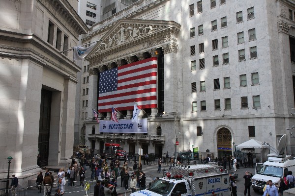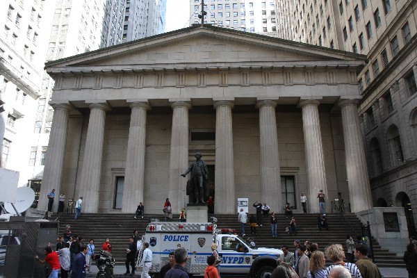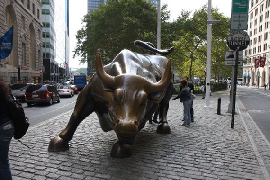 Vorbei an der Bodies-Ausstellung bis zur Anlegestelle für das Water-Taxi. Die Brücke ist nicht auf ein einziges Foto zu bringen, daher machen wir mehrere und laufe weiter Richtung Wallstreet. Hier gibt es viele Imbissbuden und Menschen in Anzügen. Vorbei am Stock Exchange Richtung Broadway.