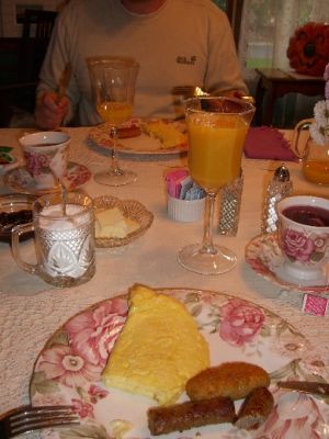 Nachdem wir gestern niemanden vorgefunden hatten, sollte es erst gegen 9:30 Uhr Frühstück geben. Reichlich spät, daher ging ich gegen 9 in die Küche und treffe Bill. Der ist schon schwer mit unserem Frühstück beschäftigt und brät den Schinken, Eier, Toast, richtet die Muffins, Obst, Bagels, Croissants, Käse, eine Aufschnittplatte Cranberrysaft nett an und wir geraten in einen Plausch.