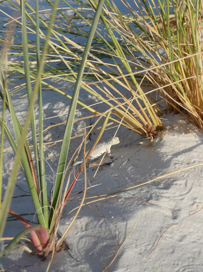 Dann geht’s wieder zurück zum WoMo (Trail Guide wieder hinlegen nicht vergessen) und auf der mittlerweile ungepflasterten Straße zum nächsten Turnout. Überall sind an der Straße Haltebuchten, von wo man in die Dünen laufen kann. Hier entdecken wir einen weißen Lizard