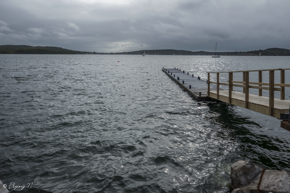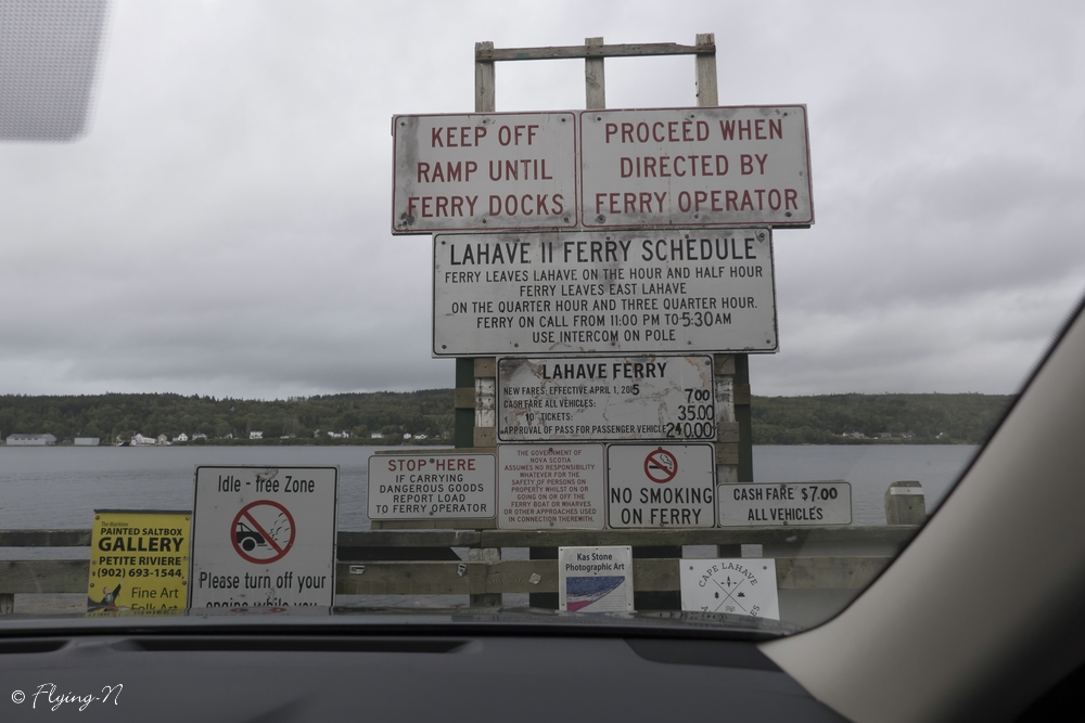Leider macht die Sonne heute schon ein kleines Päuschen…  :( Es nieselt, aber kalt ist es nicht. Da es hier keine Frühstücksmöglichkeit gibt, fahren wir wie geplant an der Küste entlang weiter Richtung Westen, auf der NS332. Bald kommen wir zum Fähranleger der Pendel-Fähre über den LaHave River.