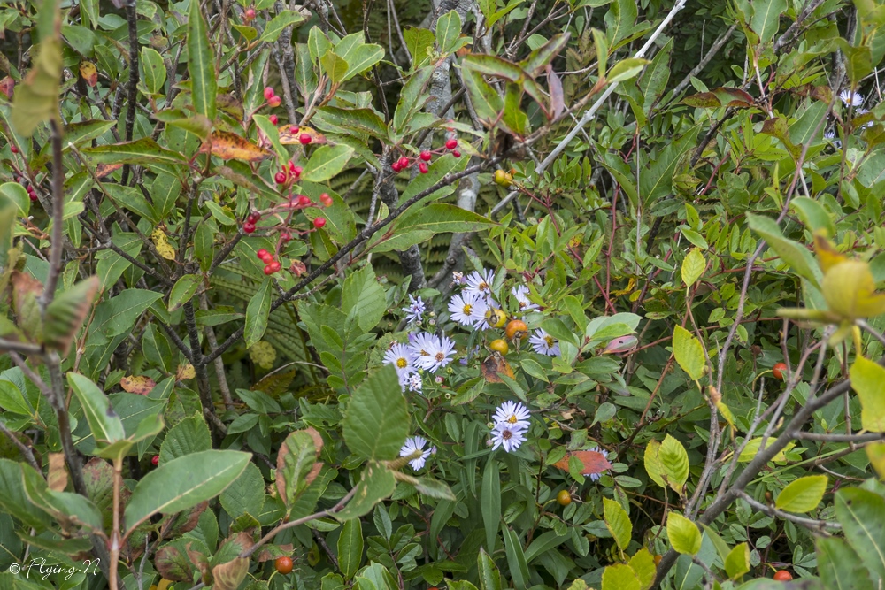 Aber Pilze gibt es dafür in Massen, leider sind wir da nicht kundig und lassen lieber die Finger davon. Im überwiegend niedrigen, aber undurchdringlichen Gestrüpp blüht es auch hie und da. Am Meer angekommen gibt es ein windiges Picknick am Strand, mit Tomate, Gurke und Brot. Zum Verweilen lädt das Wetter echt nicht ein, aber wenigstens  hat der Regen mal kurz aufgehört.