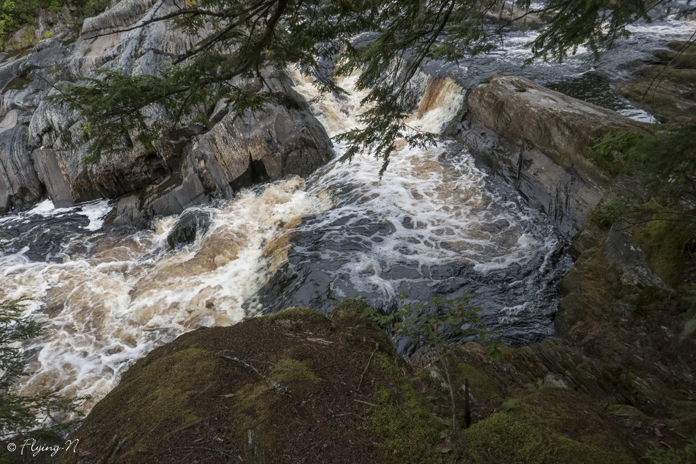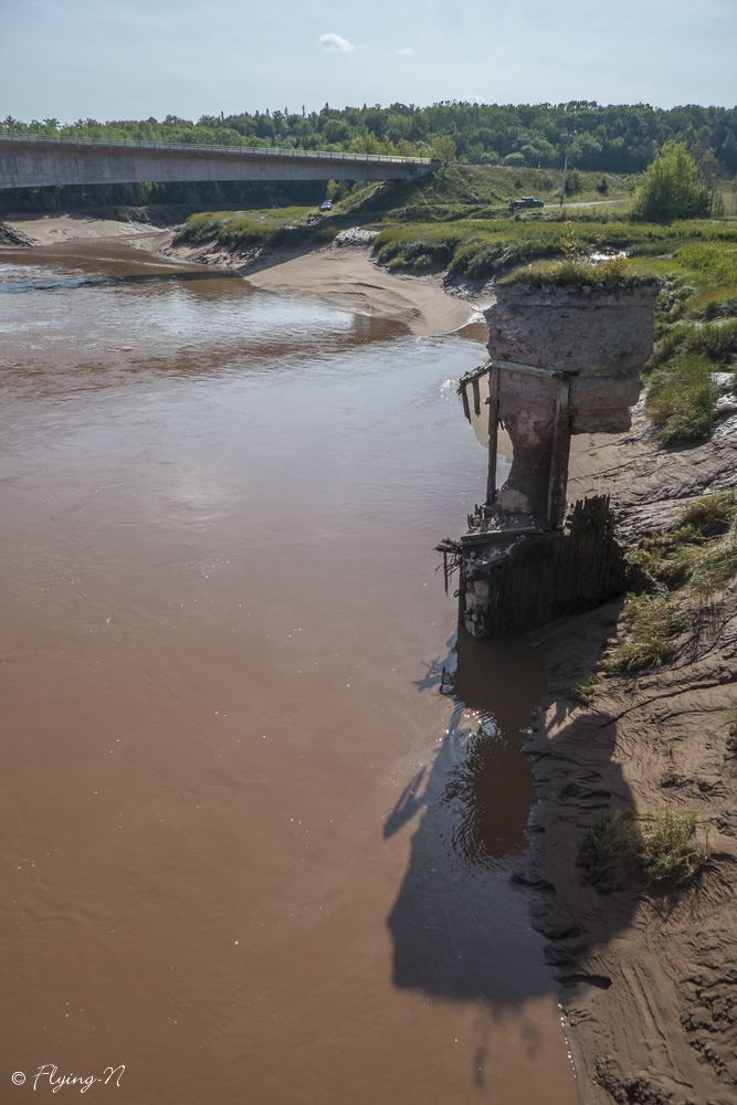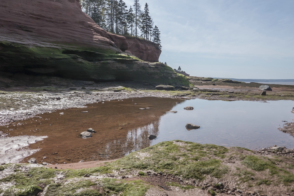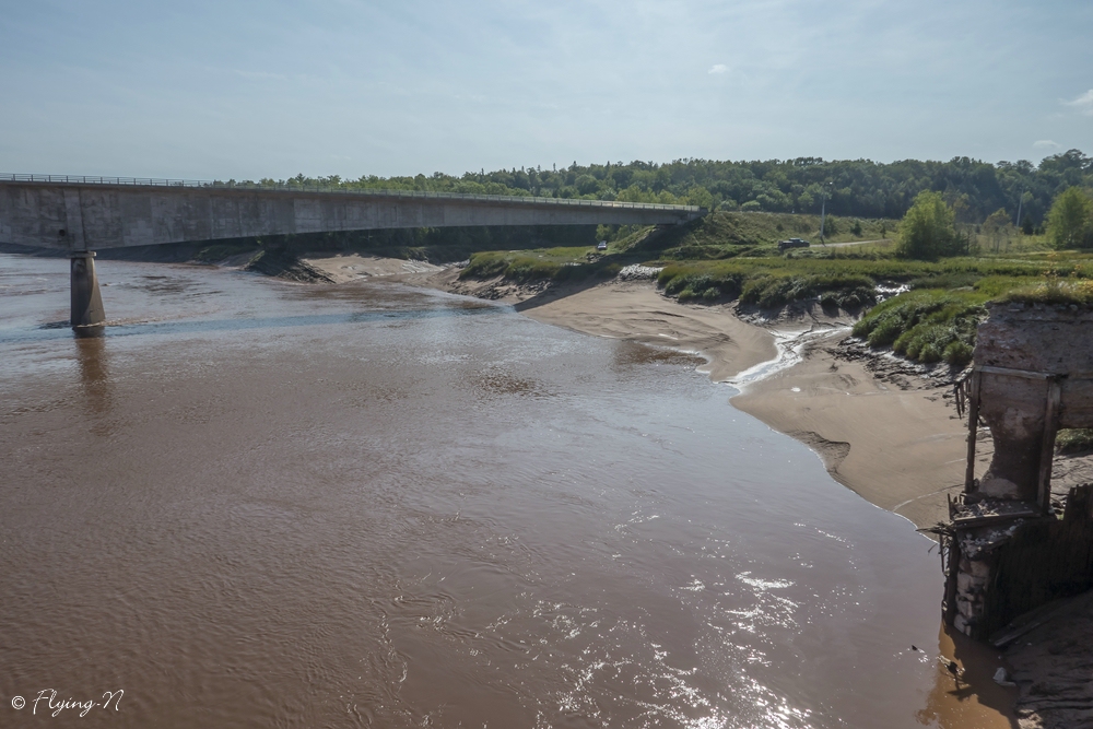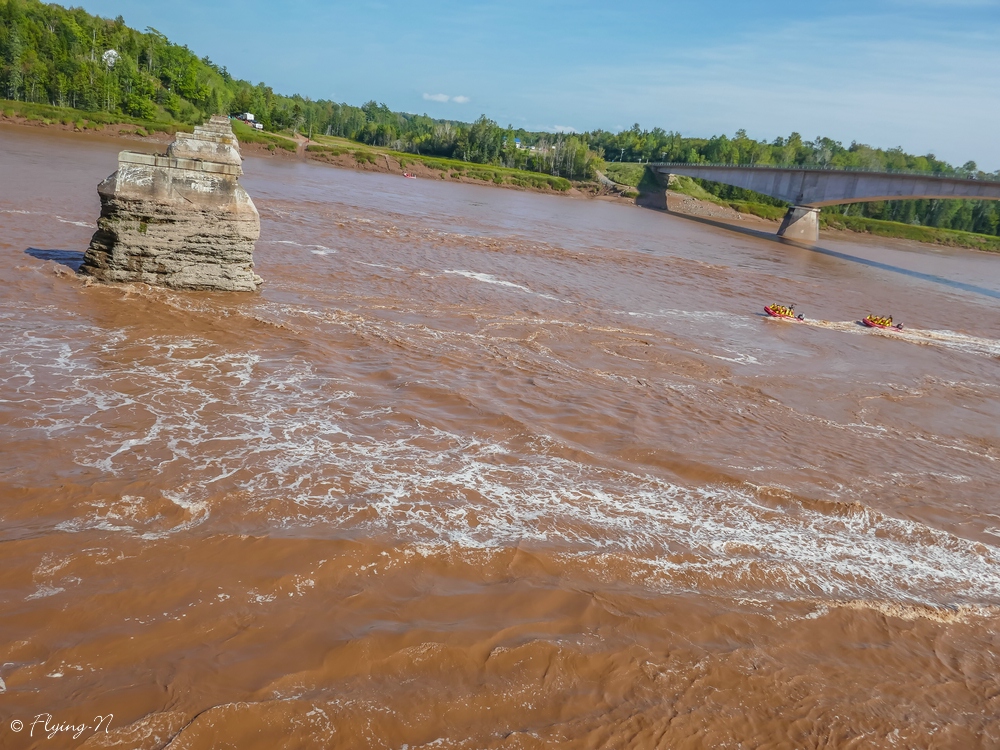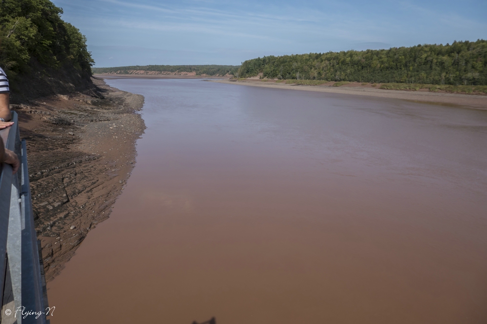 Immer, wenn die Flut dann in die Bay of Fundy herein kommt und das Wasser, da es ja keinen Ausweg gibt, sehr stark ansteigt, fangen die Flüsse, die in die Bucht münden an, „aufwärts“ zu fließen (Shubenacadie, Salmon River, Avon River). Das kann man hier sehr schön beobachten, wie innerhalb von 20 Minuten aus einem Rinnsal von Fluss ein in die falsche Richtung fließender, schokoladebrauner, reißender Fluss mit Stromschnellen wird, und dieses Spektakel wiederholt sich etwa alle 12 Stunden.