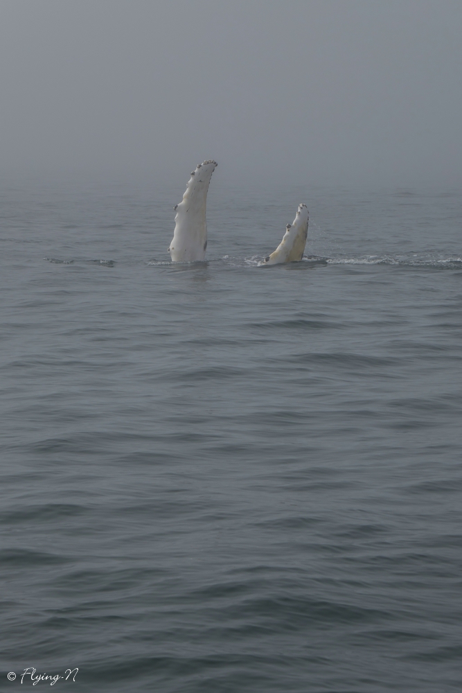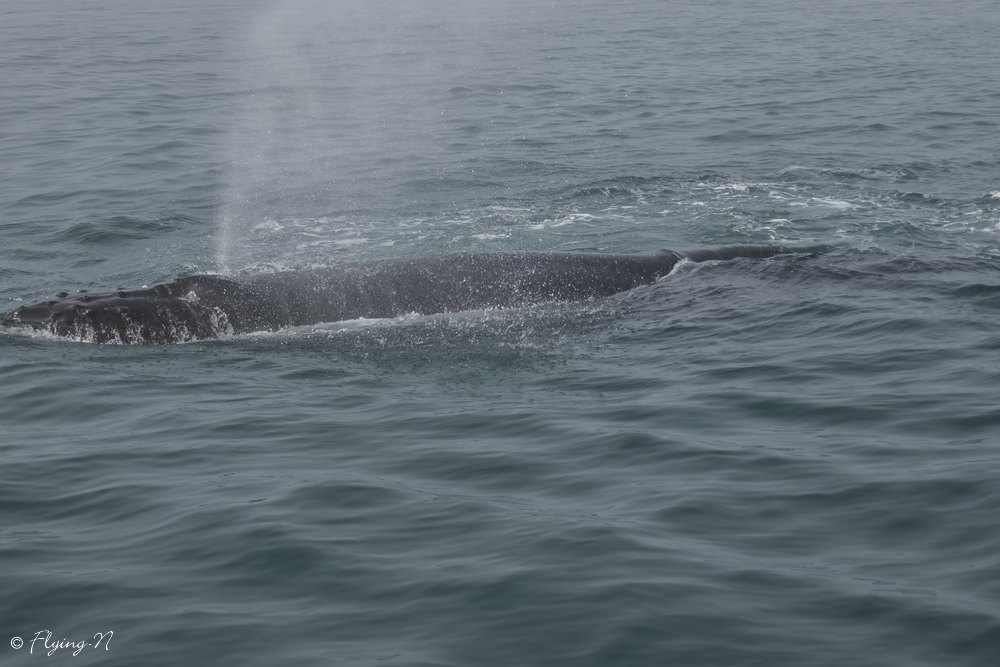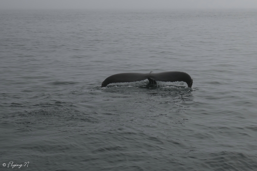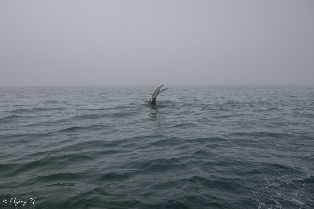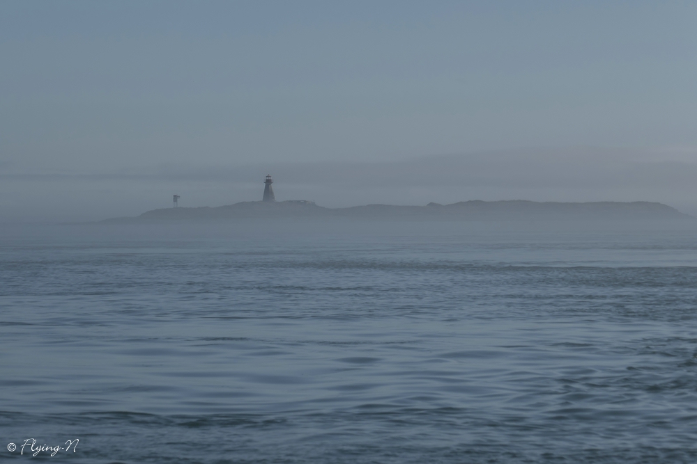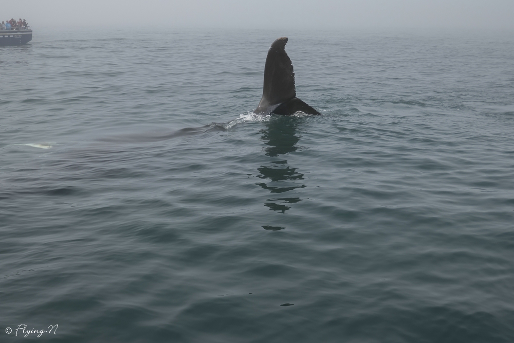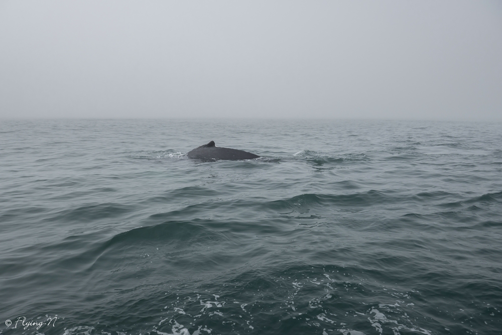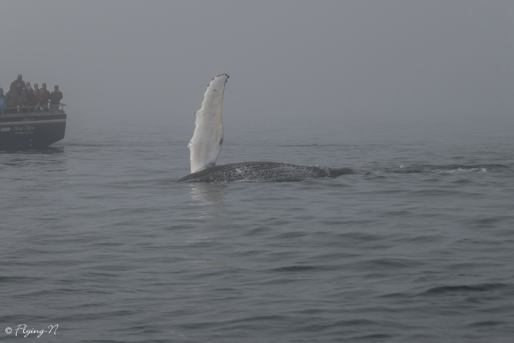 Die 15m lange „Chad & Sisters Two“ fährt hinaus in die Bay of Fundy, leider ist der Nebel immer noch dicht, obwohl man merkt, dass die Sonne sich langsam durchkämpft. Penny, die Inhaberin, und Guide Amy erklären, dass Tiersichtungen natürlich nicht garantiert werden können, und erläutern allgemeine Fragen zu den Walen und anderen Tieren hier. Es sind noch mehrere Tourboote unterwegs, unter anderem sehen wir auch ein Zodiac. Die Kapitäne benachrichtigen sich gegenseitig, wenn sie etwas Interessantes entdecken (Konkurrenz hin oder her) und so haben wir bald Glück: Buckelwale! Immer wieder sichten wir ein, zwei oder gar drei Tiere, mal etwas weiter entfernt, mal ganz nah beim Boot. Mensch, ist das beeindruckend! Ich bin total geflasht, das ist ja echt der Hammer. Diese riesigen Tiere scheinen keine Angst zu haben, sie kommen ganz freiwillig näher, wenn sie Lust haben.