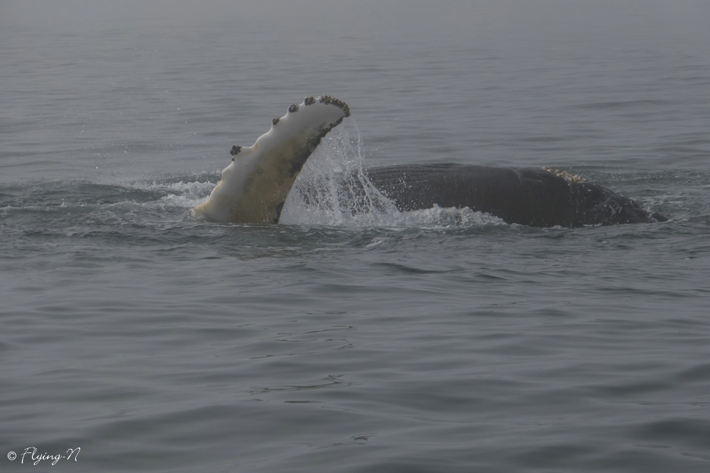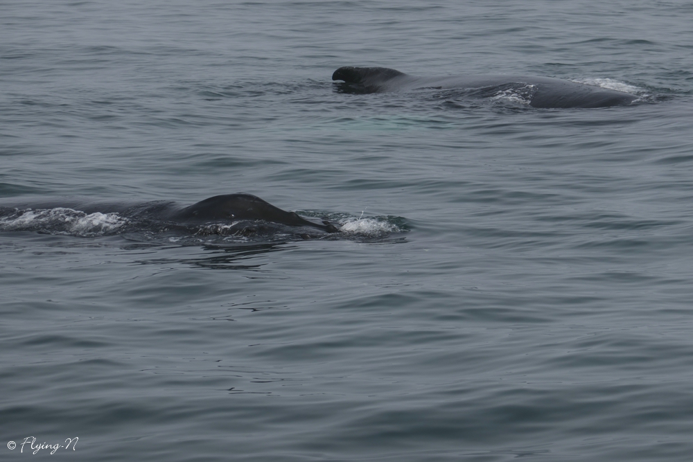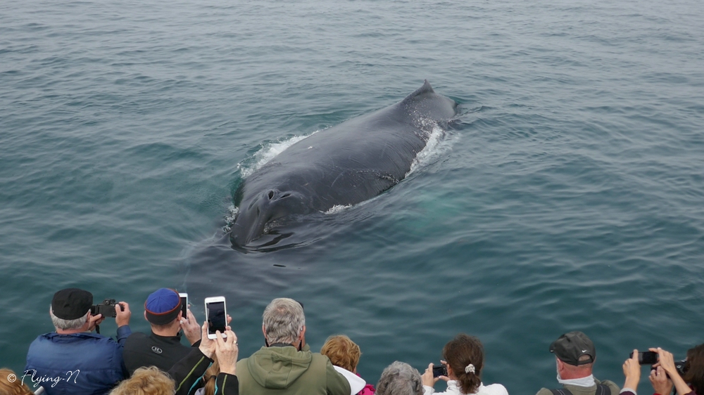 Da sehen wir in der Ferne, bei einem anderen Boot, einen Wal mit den Flossen planschen. Wir fahren näher ran, und da ist ein Muttertier mit einem Kalb, welches sich köstlich mit Rückenschwimmen, Rolle links- und rechts herum zu amüsieren scheint. Vielleicht versucht es auch, uns nass zu spritzen? Fast gelingt es! Mutter schwimmt ruhig nebenher und taucht nur alle paar Minuten zum Atmen auf. Die „Show“ dauert etwa eine halbe Stunde, wie gebannt stehen alle mit ihren Kameras da und beobachten das Treiben.