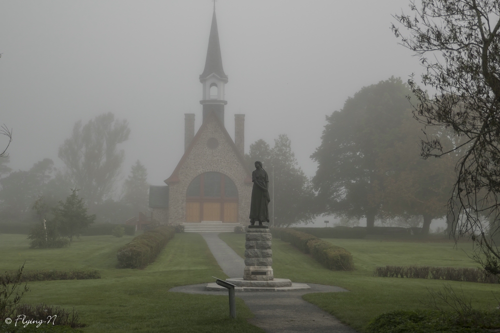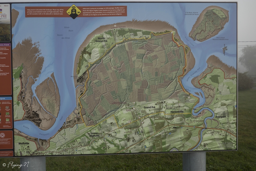 Frühstück im am Hotel angeschlossenen Café gibt es erst ab 9 Uhr, das ist uns viel zu spät. Stattdessen fahren wir zum Grand Pré National Historic Site (UNESCO Weltkulturerbe seit 2012). Das Museum/Visitor Centre öffnet zwar auch erst um neun, aber auf dem Gelände kann man einfach so herumlaufen. Durch den Morgennebel herrscht eine ganz besondere Atmosphäre, das hat auch was!