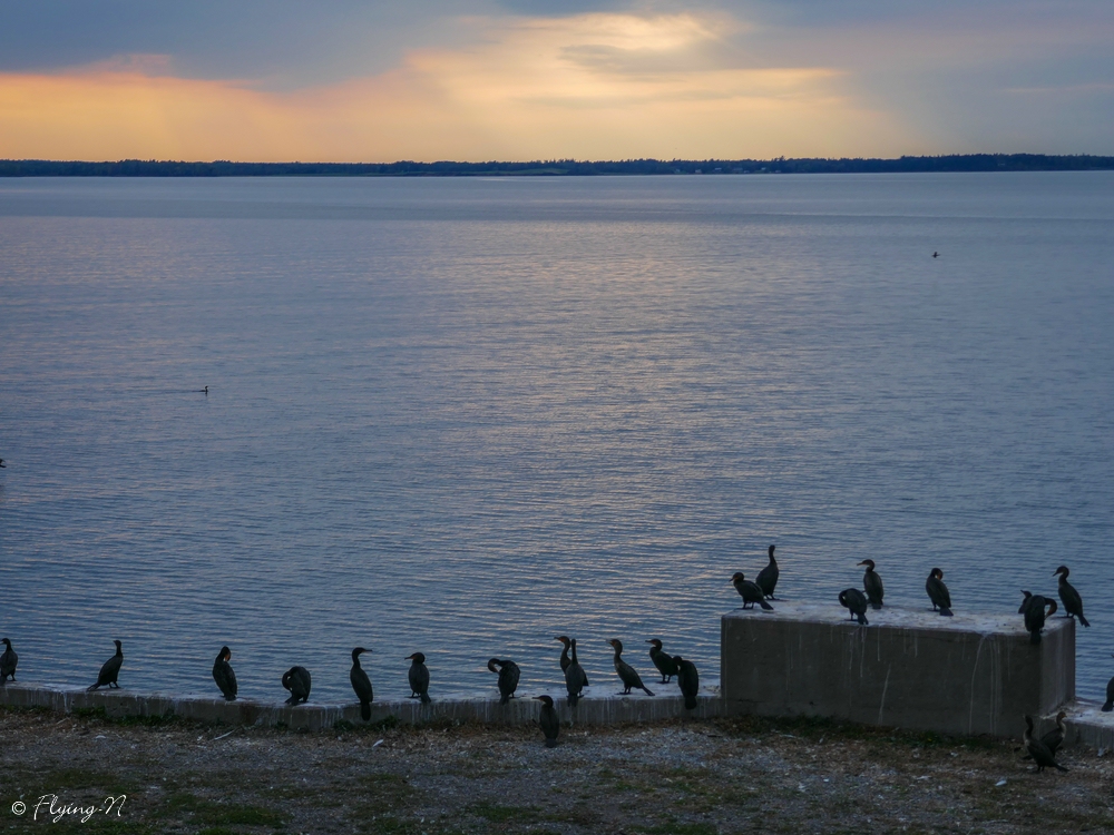 Es ist nicht viel los, aber es stehen viele Dauercamper auf dem Platz (die jetzt nicht anwesend sind). Nachdem wir auf unserem Platz eingeparkt haben, beschließen wir spontan, Wäsche zu waschen. Nebenher wird Abendessen gekocht (lecker frischer Lachs + Salat) und vorher gibt es noch einen Apéritif direkt am Wasser, da stehen praktischerweise Sitzbänke.
