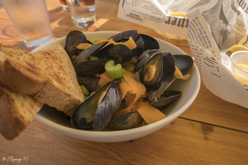 Gegen Mittag kommen wir nach North Rustico, wo wir nach einem kleinen Spaziergang und Abstecher zum Leuchtturm ein Lokal aufsuchen, um fischig mittagzuessen. Wir sitzen natürlich draußen und es gibt Muscheln mit Gemüse und Fish & Chips. Sehr lecker und frisch.