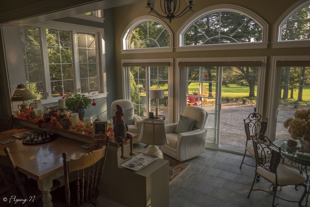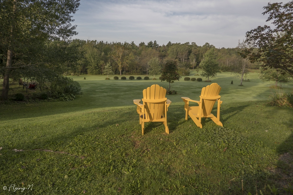 Dort wartet ein weiterer Höhepunkt auf uns: Unser Bed & Breakfast ist einfach traumhaft: Ein wunderschönes altes Haus, liebevoll und geschmackvoll möbliert und dekoriert, auf einem parkartigen Anwesen gelegen, der absolute Knaller! Im Flur ein kleines Regal, mit Pantoffeln, wo man seine (Straßen-)Schuhe parken kann, ein riesiger Wintergarten, alles sehr schön eingerichtet und dekoriert – schon ein bisschen wie Museum, also abstauben möchte ich das nicht alles müssen! – aber sehr stimmig. Unser Zimmer ist oben, hat auch eine Klimaanlage, die ich mal eben einschalte, weil es sehr warm und stickig ist. Unser (privates) Bad ist über den Flur, das stört mich nun wirklich nicht sehr. Wir sitzen abends noch auf der Terrasse und beobachten Rehe, die zum Fressen an eine Futterstelle kommen und plaudern noch ein wenig mit dem Host Con. Er kam mit 6 Jahren mit seinen Eltern aus Wien nach Kanada, kann auch tatsächlich ein wenig deutsch – Schäferhunde sind sein Hobby…. Das 12ha große Anwesen haben er und seine Frau Rose seit 40 Jahren, es ist nicht eingezäunt, die Tiere, die dort leben, sind alle wild.