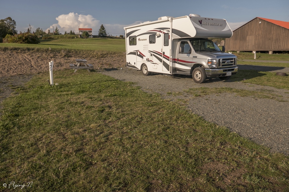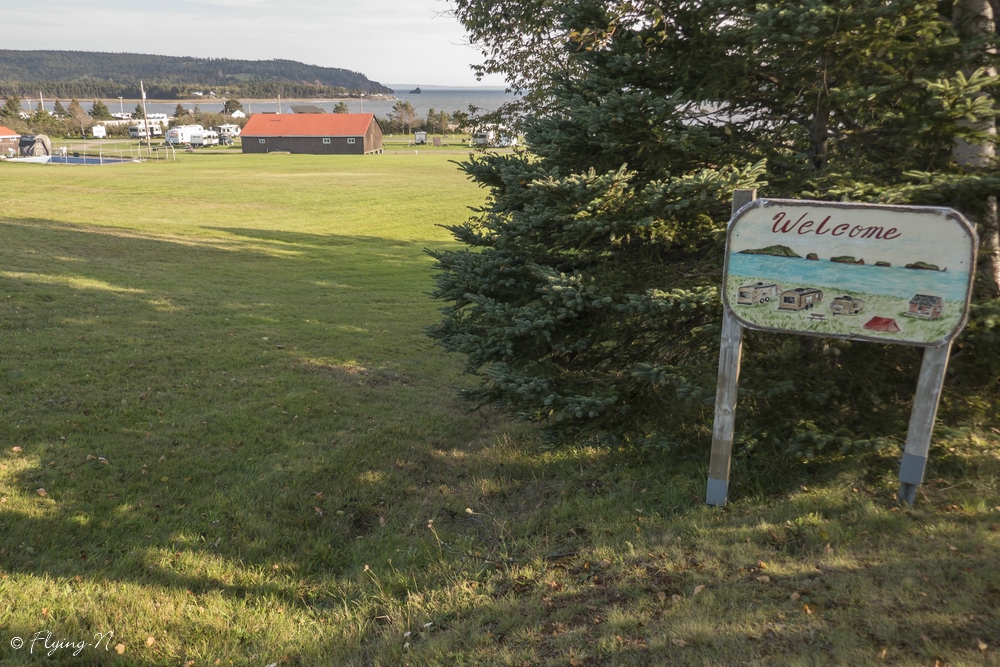 Das letzte Stück bis zum Five Islands Ocean Resort & Campground ist nicht weit, er liegt wunderbar direkt an einer Bucht. Wir machen uns beim Office per Klingel bemerkbar, aus der Gegensprechanlage hören wir „I’m coming!“ Der Host kommt von unten mit einem Golfcart angefahren, checkt uns ein, dreht uns Feuerholz an (was wir wegen des Windes gar nicht benutzen können).