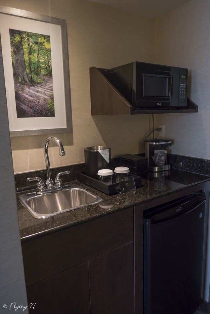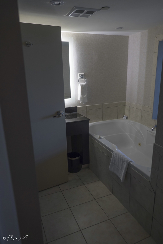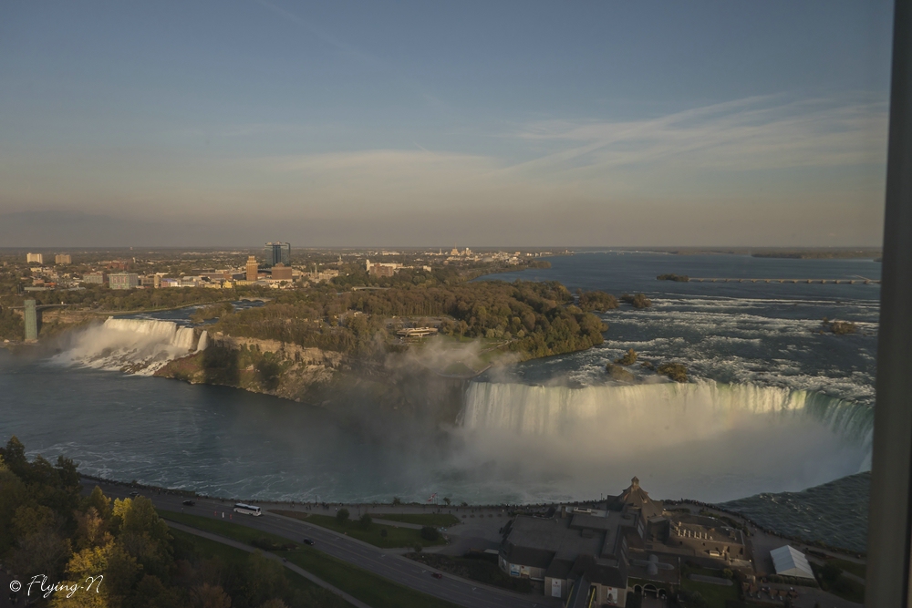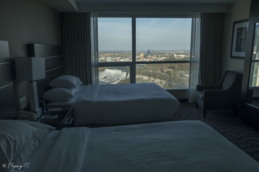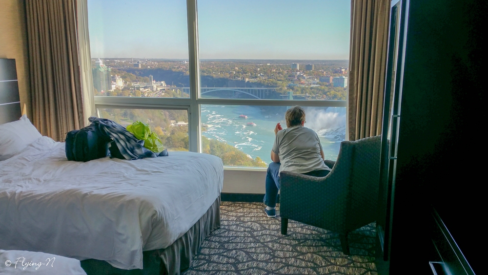 Beim CheckIn will man uns ein schöneres Zimmer verkaufen, für 50$ können wir „Blick auf Horseshoe & American Falls“ haben. Wir lehnen dankend ab. Aber dann… ist unser Zimmer noch nicht fertig… und wir bekommen den upgrade kostenlos!! Wie g. . . roßartig ist das denn? Als wir zum Zimmer in der 32. Etage kommen, verschlägt es uns fast die Sprache: Der Blick, die Aussicht, das Panorama… einfach umwerfend! Ansonsten ist das Zimmer, naja, geräumig (Vorraum, kleine Küchenzeile, Bad mit Whirlpool, WC, Zimmer mit zwei Betten und bodentiefen Fenstern), gut ausgestattet, aber schon auch etwas abgewohnt und nur 80% sauber, wenn man mal schwäbische Maßstäbe anlegt. Aber wir wollen nicht meckern, das habe ich vorher gewusst und wir sind schließlich wegen der Aussicht hier.