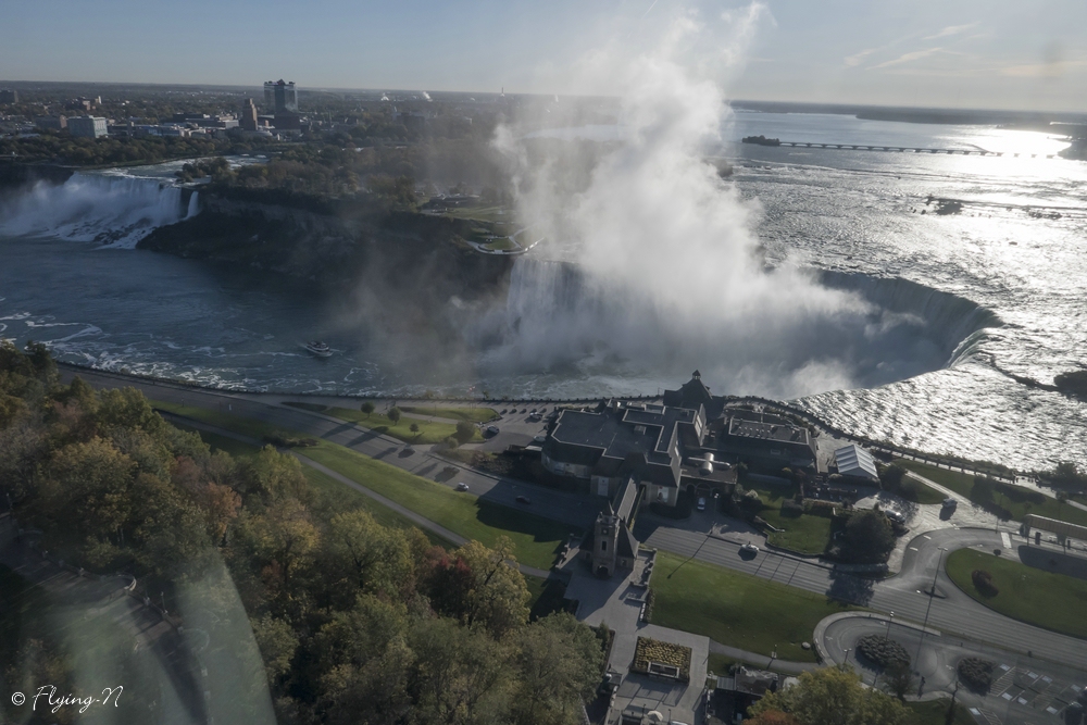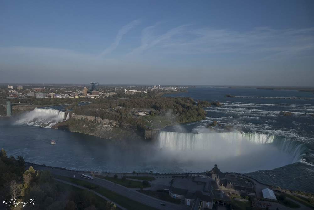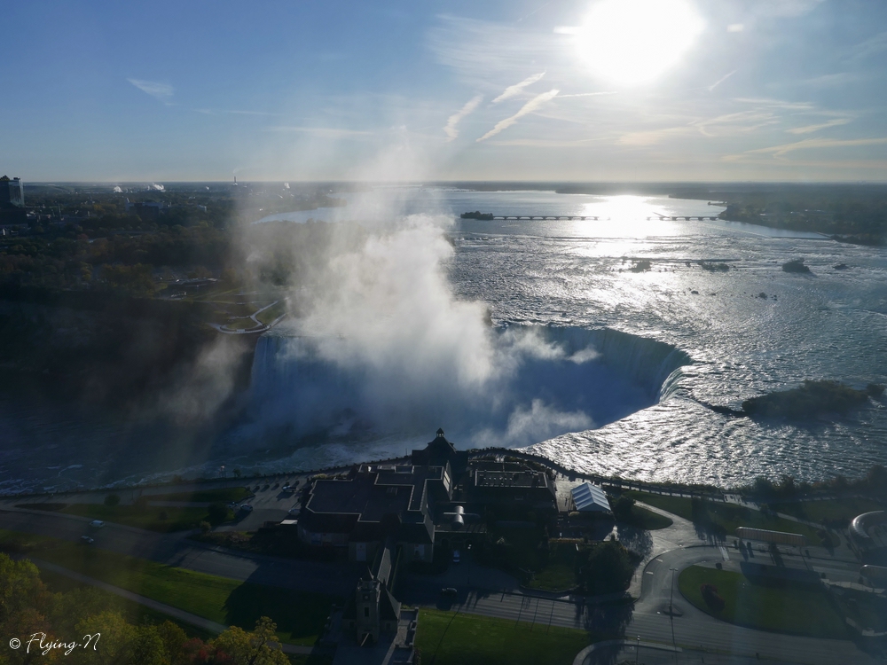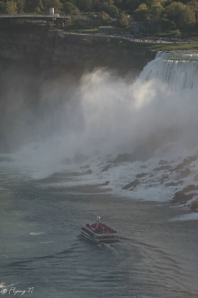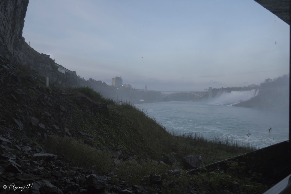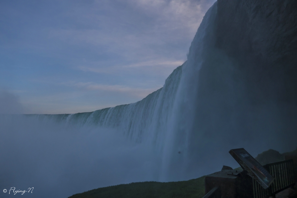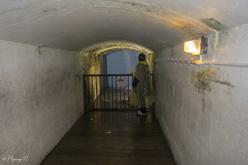 Schnell mit dem Aufzug nach unten, die Regencapes übergezogen und los geht es durch die Tunnels mit Aussichtsportalen hinter den Horseshoe Falls. Der Vorteil um diese Zeit: Keinerlei Warteschlangen, es ist kaum was los. Imposant sind diese Wassermassen, die hier herunterdonnern, man kann die Erschütterungen direkt spüren, und ein bisschen nass wird man auch.