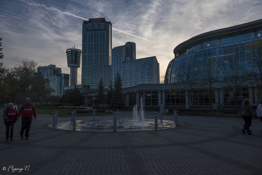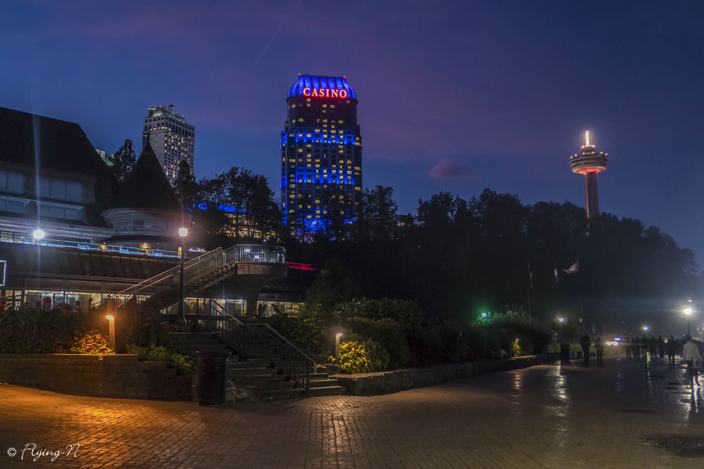Und nun, nach einem kurzen Stopp bei der Floral Clock (die ich mir irgendwie schöner vorgestellt hatte) zum letzten Highlight der Reise, den Niagarafällen. Ich war schon zweimal dort, aber für meinen Mann war es das erste Mal. Außerdem habe ich sie auch noch nie bei Nacht, also illuminiert, gesehen. Daher habe ich ein Zimmer mit Falls View im Embassy Suites Hotel direkt an den Horseshoe (oder: Canadian) Falls gebucht. Ich hatte ja hier im Forum gefragt, wie es mit dem Parken aussieht. Wir sind also seelisch schon auf Valet-Parking für 26$ eingestellt. Es ist dann aber doch noch einiges teurer, und wir zögern etwas… da gibt uns jemand den Tipp, gegenüber beim Spielcasino zu parken, dort bezahlt man 1x pro Ausfahrt, und im Moment kostet es 5$ (Preise ändern sich je nach Tag und Uhrzeit). Also nichts wie hin, da sind die Schwaben gleich dabei! Natürlich laden wir erst unser Gepäck aus, auf das ich aufpasse, während Männe allein parken geht.