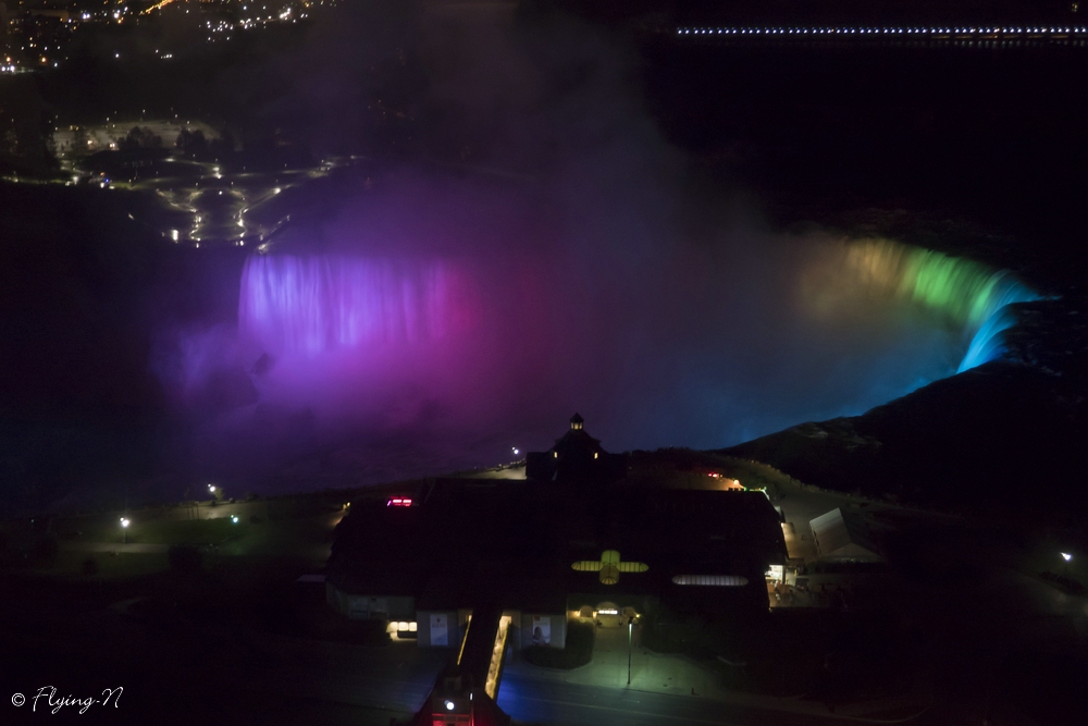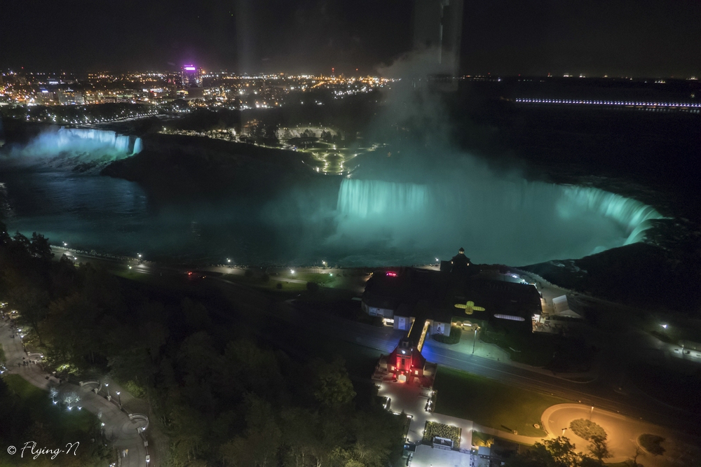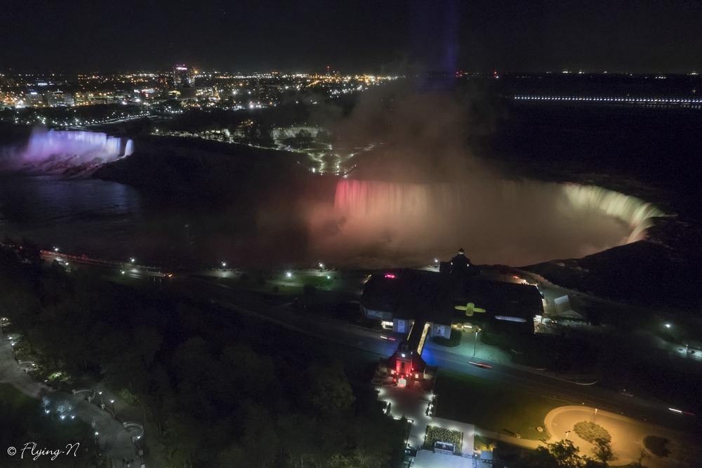 Auf die Bootstour verzichten wir dafür, da erlebt man im Prinzip auch nichts anderes, außer dass man noch zu den American Falls rüber fährt. So, zum Abschluss noch ein paar Selfies oben an der Aussichtsplattform, die Falls sind jetzt schon beleuchtet, und die Farben wechseln alle paar Minuten – weiß, gelb, grün, rot, lila, regenbogenfarben, da ist alles dabei. Dann fahren wir mit der Incline Railway wieder nach oben zum Hotel, der Hunger ruft. Zum Abendessen gehen wir nach nebenan zu Applebee’s, ist ok, aber nichts Besonderes.