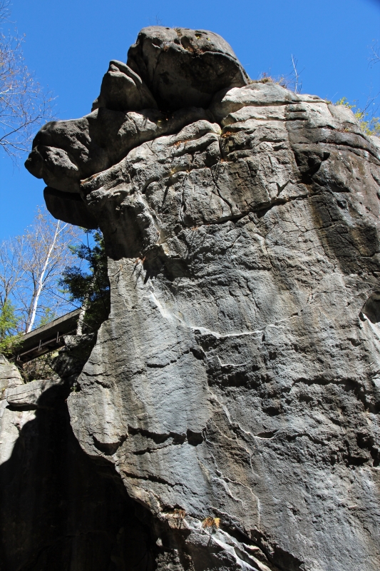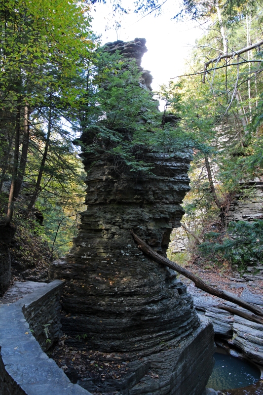 Anschließend gehen wir den Gorge Trail hinauf, über unendlich viele Stufen an ebensovielen Kaskaden entlang. Kurz vor dem Pinnacle Rock, einer isolierten Felsnadel, gibt es eine Abkürzung zum Rim Trail. Der Pinnacle Rock steht leider ziemlich im Schatten und Gebüsch. Nachdem ich noch einen kurzen Ausflug bis dahinter unternommen habe, gehen wir diese Abkürzung und den sehr hübschen Waldweg hinunter. Ausblicke auf die Gorge bietet der allerdings fast keine. An einem wenig aussichtsreichen Overlook treffen wir auf ein amerikanisches Paar, mit dem wir uns über die verschiedenen Parks und Fälle austauschen. Sie empfehlen uns, den Robert H. Treman Park auch zu besuchen.