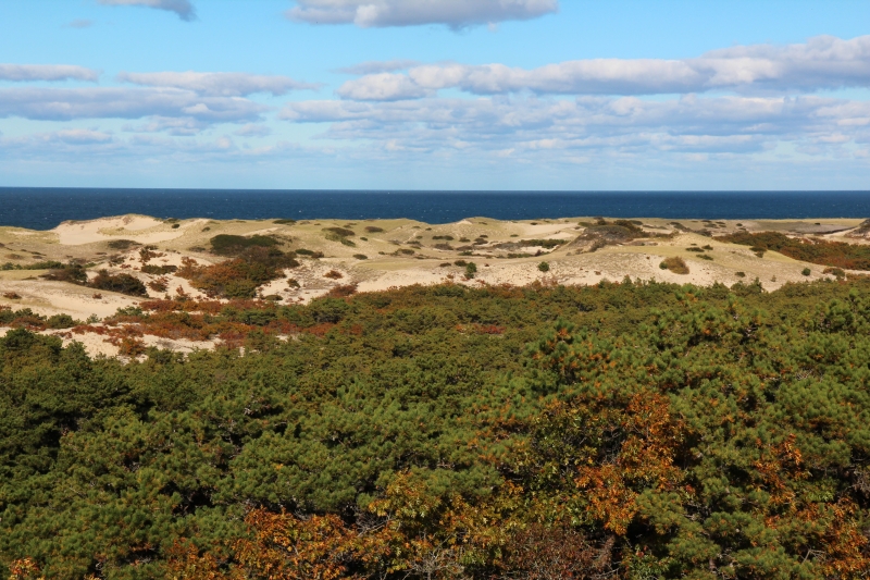 Zurück auf dem Parkplatz vertilgen wir ein Joghurt, Banane, und Apfel, bevor wir uns auf den Weg zum Race Point machen. Hier gibt es schöne Dünenlandschaften und Strand und Meer zu besichtigen. Bei Pilgrims Heights gehen wir anschließend den kurzen Swamp Trail mitten durch bunte Sträucher und mit phänomenalem Blick auf das Meer. An dem Aussichtspunkt erzählt uns ein Paar aus Texas, wo man hunderte von Seehunden erleben kann, die bei Ebbe ausruhen. Das wäre aber wohl ein ziemlich langer Hike, wofür wir absolut keine Zeit haben.