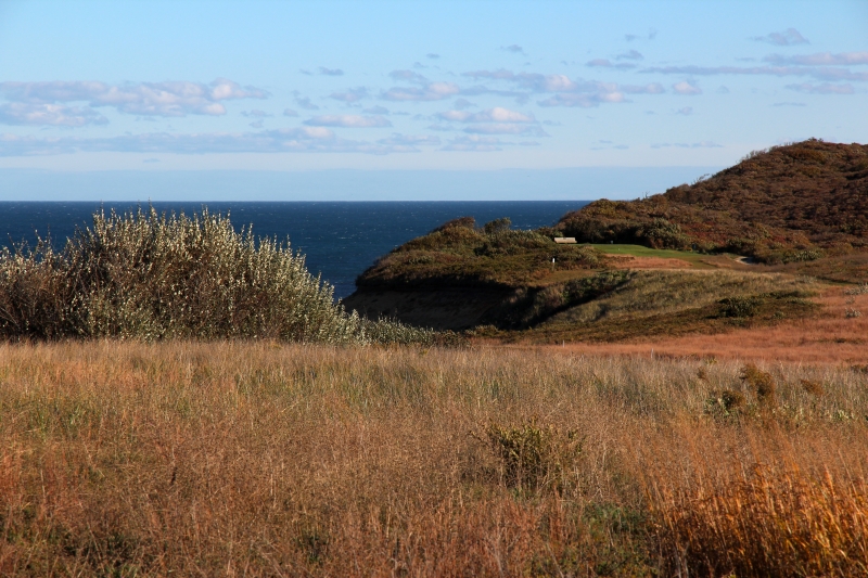 Statt dessen fahren wir nach der Rückkehr zum Auto zum Cape Cod Light, das hinter einem Golfplatz liegt. Allmählich kehrt die Golden Hour ein und wir haben schön leuchtendes herbstliches Grasland vor uns. Danach folgen wir ein Stück dem Ocean View Drive mit erneutem Fotostop am White Crest Beach. Wieder zurück auf der US 6 fahren wir nach Süden und zweigen nach kurzer Strecke schon wieder ab Richtung Küste zum Nauset Light. Von dort gehen noch den kurzen Weg zu den Three Sisters Lights. Die sind nicht am Meer, sondern in einem kleinen Wald nebeneinander aufgebaut. Von einem Parkplatz am Strand muß man etwa zehn Minuten laufen, um dorthin zu kommen. Anschliesend gibt es wieder ein kurzes Stück Ocean View Drive bis zum Coast Guard Beach, wo wir eine hübsche Marschlandschaft vorfinden.