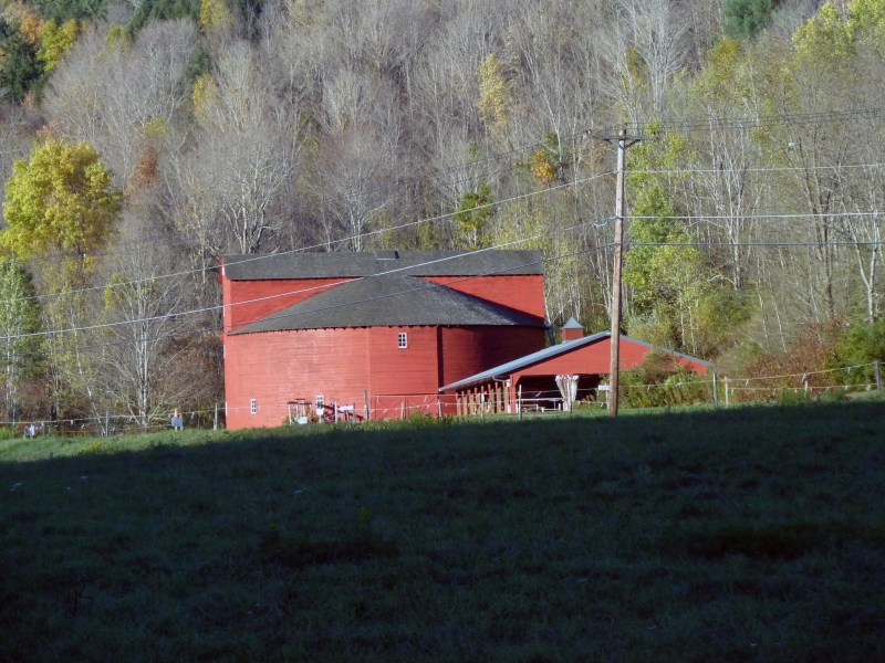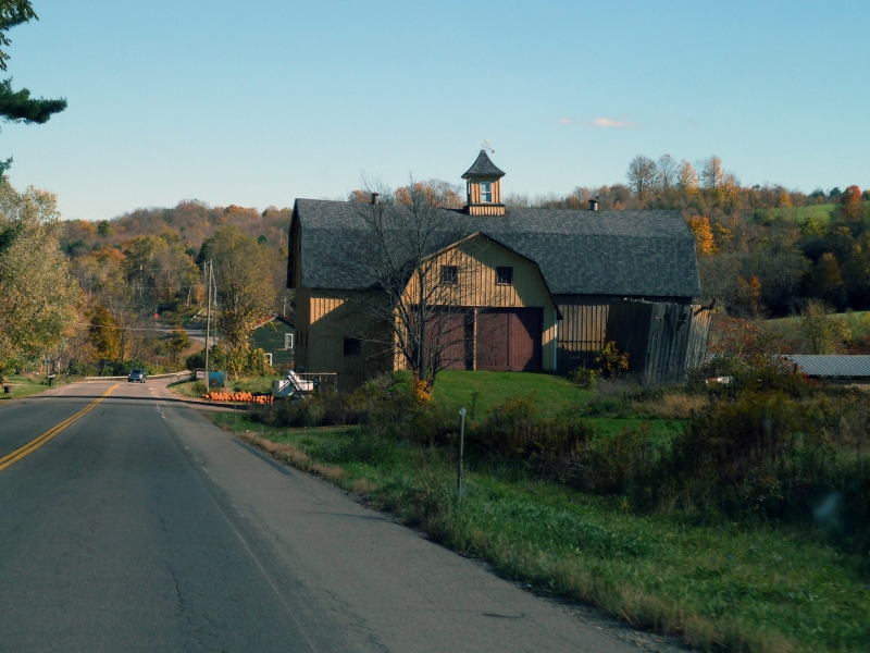 Nach gut zwei Stunden sind wir in Downsville, wo es wieder eine – allerdings etwas simplere – covered bridge gibt. Von dort haben wir noch eine weitere knappe Stunde zu fahren, zunächst an einem Stausee und anschließend an zunehmend gepflegten und wohlsituiert aussehenden Villen und Farmen vorbei nach Roxbury zu unserem heutigen Quartier. Nicht allzu weit vor Roxbury fällt uns noch eine große runde rote Barn ins Auge – darin findet offenbar ein Farmers Market statt (natürlich nicht zu der Zeit, wo wir am Weg sind).
