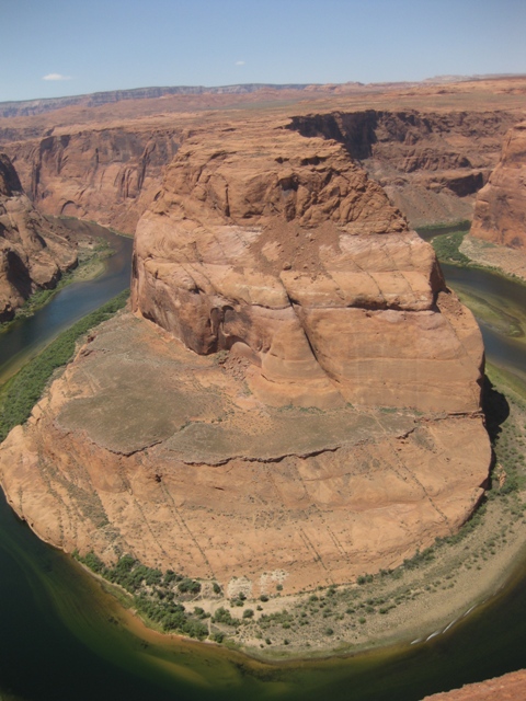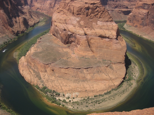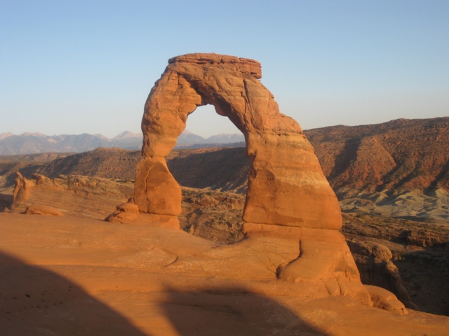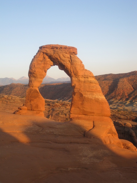 Wir waren auch sehr froh, dass wir so früh oben waren. So eine knappe halbe Stunde vor Sonnenuntergang legte sich langsam der Schatten über den Arch und danach fanden wir das Lichtspiel nicht mehr ganz so toll. Außerdem hatten wir dadurch auch genügend Zeit, die Augenblicke abzuwarten, wenn sich nicht gerade wieder jemand ganz wichtig unter den Arch stellen musste. Dies ging wirklich die ganze Zeit so, dass sich irgendjemand, den Hampelmann machend darunter stellte, obwohl man ihn auf dem Bild eh nur winzig sieht, während die ganze Meute, die den Arch allein fotografieren wollte lauthals buhte. Ich buhte natürlich mit, was meinen Mädels sehr peinlich war.
