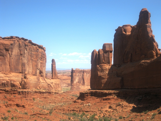 Nachdem der Sonnenuntergang am Delicate Arch ein Fixpunkt war, entschieden wir uns bei der Hitze gegen die etwas längeren Wanderungen zum Double-O-Arch und zum Landscape-Arch. Wir fuhren die direkt zugänglichen Aussichtspunkte ab. Obwohl es nicht wirklich einen Arch zu bestaunen gibt, gefiel es mir am ersten Aussichtspunkt dem „Park Avenue Point“ ausgesprochen gut.