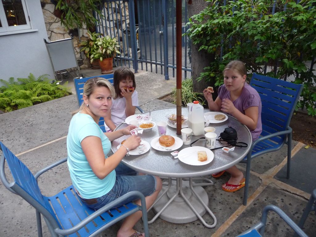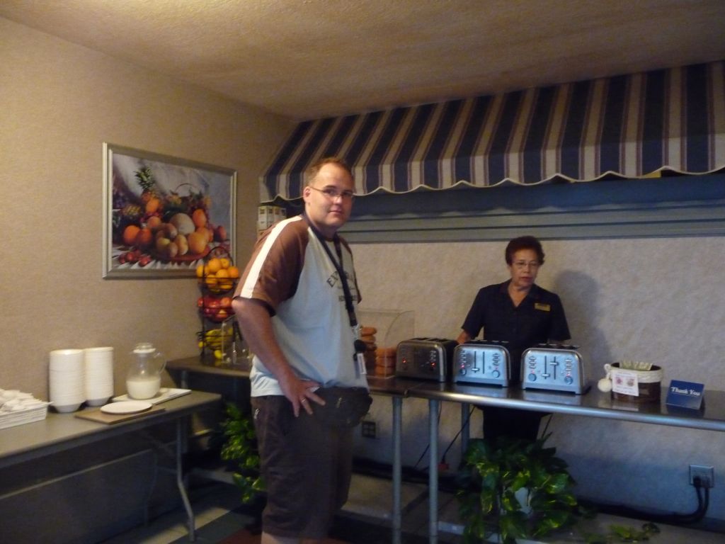 Endlich um 6:30 öffnete der Frühstücksraum in der Travellodge at LAX (sauber, günstig aber die Umgebung ist schon gewöhnungsbedürftig).