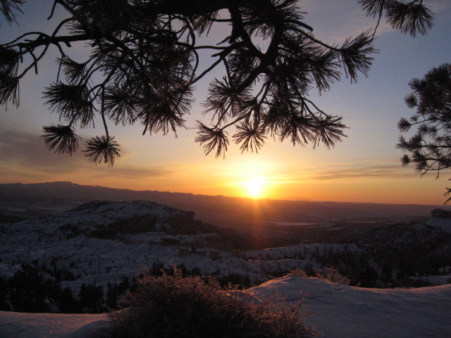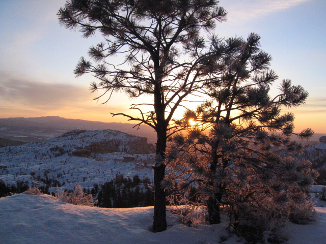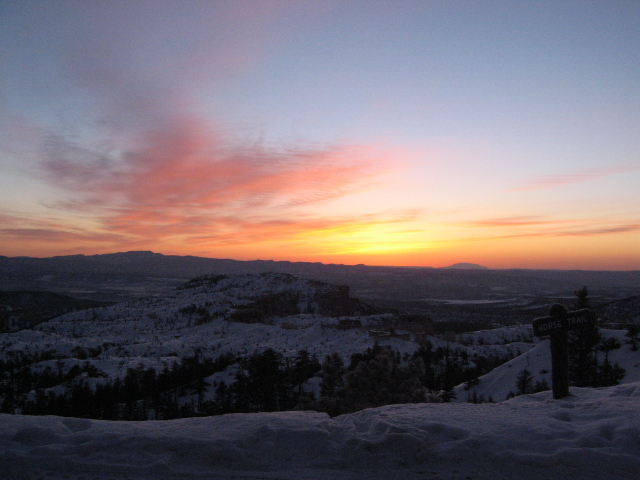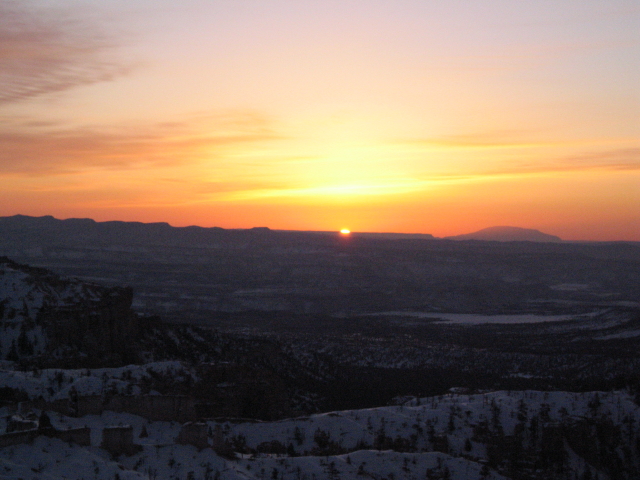 Um 7 Uhr dränge ich zum Aufbruch, weil es mir draußen schon ziemlich hell erscheint. Der Hase meint "ist ja klar, es ist doch auch Vollmond.." Tssss. Um 7:15 Uhr machen wir uns nach einigen Minuten "Trailblazer-Auftauen-lassen" auf den Weg und es IST schon ziemlich hell und das kommt nicht vom Mond! Patrick gibt dem Chevy die Sporen und wir erreichen den Sunrise-Point wirklich einige Minuten vorm Sonnenaufgang. Bei dieser Eiseskälte also genau zum richtigen Zeitpunkt und das Best... wir sind tatsächlich ganz allein! Gigantisch! Als die Sonne hinter dem Berg hochkrabbelt hab ich nicht bloß von der Kälte eine meterdicke Gänsehaut.