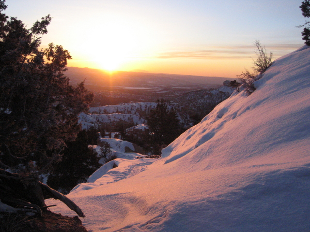 Auf 9000 Fuß hat man einen tollen Blick ins Tal. Bei der Weite der Landschaft -total verschneit und fast menschenleer- habe ich den Gedanken an Cowboys in dicken, fellgefütterten Jacken, die um ein Lagerfeuer sitzen, über dem ein dampfender Kessel Kaffe brodelt.. ich schaue definitiv zuviel Marlboro-Werbung im Kino...