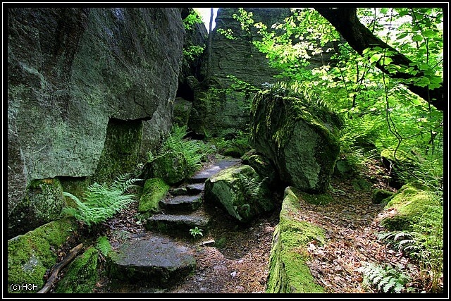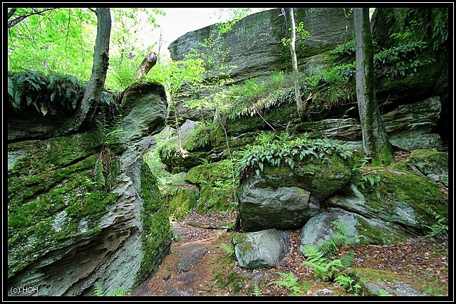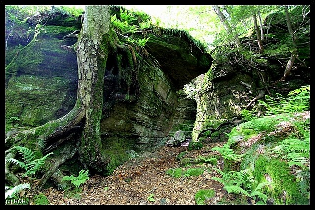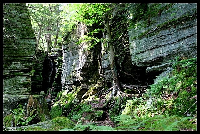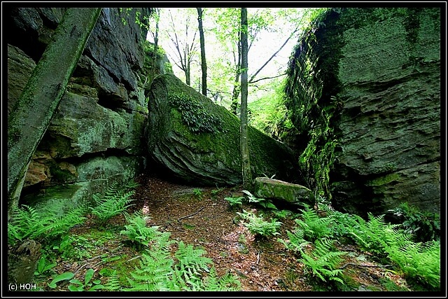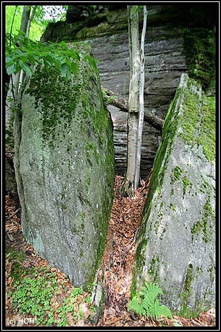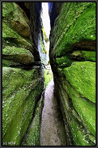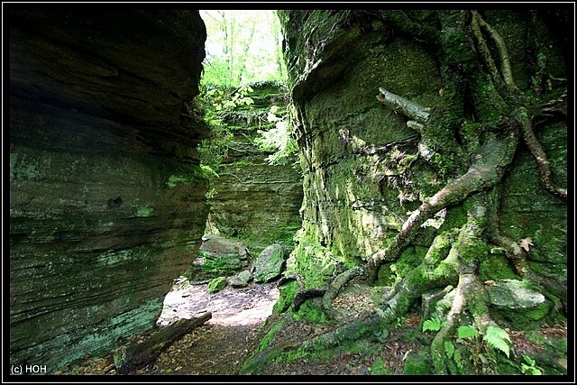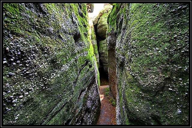 Das wir von hinten nach vorne gehen hat den Vorteil, das der Teil mit den größten Felsen und Engpassagen zum Schluss erst kommt. Hier bei den Engpassagen teilweise von Slots zu sprechen wäre zwar übertrieben, trotzdem sind die schmalen und mit Moos überzogenen Felsspalten ein beeindruckender Anblick. Leider kann ich mich wegen der Rückentrage aber nicht wirklich dort hinein quetschen und für Danielle kommt so etwas eh nicht in Frage … zu eng, zu hoch, zu viel Angst und überhaupt – das kann ja noch lustig werden wenn wir irgendwann einmal im Westen unterwegs sind.