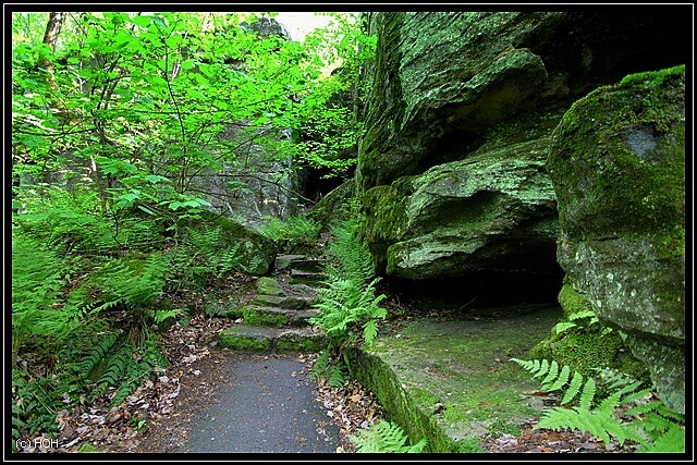 Der Park ist in Privatbesitz und hat somit keinen staatlichen Status wie "State Park" oder ähnliches, selbstverständlich hat man aber auch hier eine Möglichkeit gesehen aus der Natur eine Art Gelddruckmaschine zu machen und es werden 4,50$ pro Person fällig, Finley wird wieder in die Rückentrage getackert und zahlt selbstverständlich noch nichts. Eine Parkgebühr für’s Auto entfällt. Entdeckt wurde die Ecke hier im Jahre 1890 als man angefangen hat nach Öl zu bohren, als dabei bekannt wurde das es ungewöhnlich viel Felsen hier gibt wurde das ganze für den Tourismus entdeckt und sogar ein Hotel zwischenzeitlich gebaut. Dieses gibt es inzwischen nicht mehr, stattdessen findet man einen Gift Shop und man hat die Möglichkeit sich hier trauen zu lassen. Als wir am Anfang des Trails sind bemerken wir das genau JETZT auch noch eine Trauung stattfindet, warum man aber ausgerechnet diesen Ort hier dafür aussucht bleibt mir ein Rätsel !? Der Loop ist circa eine halbe Meile lang, verlaufen kann man sich im Prinzip nicht obwohl es hier und da immer wieder Trampelpfade gibt die vom Main Trail wegführen oder ihn kreuzen. Ich muss ehrlich sagen, ich kann nicht verstehen wieso es hierüber keine vernünftigen Bilder oder Infos im Internet gibt, solch einen Ort würde man an dieser Stelle des Landes eigentlich gar nicht vermuten. Ich denke es liegt ganz einfach an der geographischen Lage, die nun nicht unbedingt auf der Reiseroute der meisten Leute liegt. Wir gehen den Trail in die verkehrte Richtung und laufen den Loop quasi von hinten nach vorne.