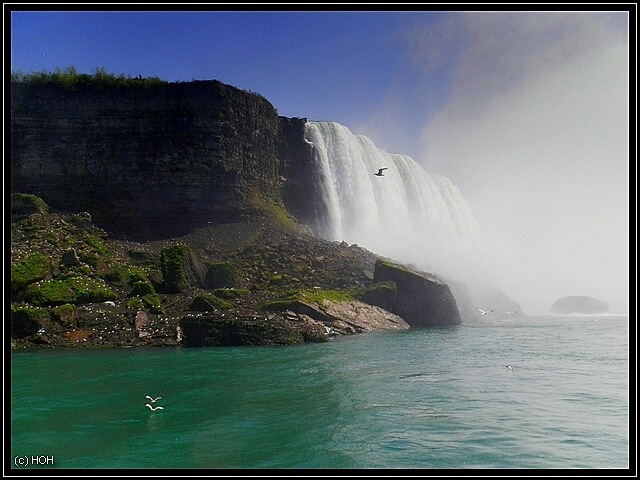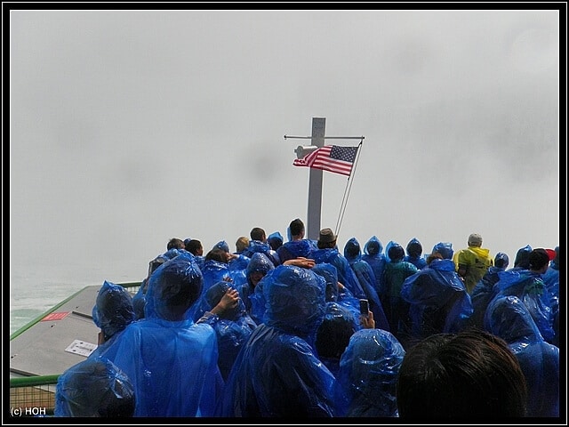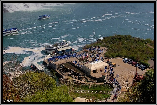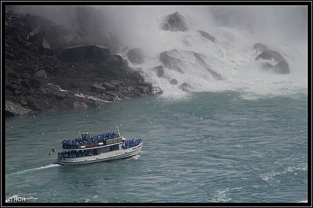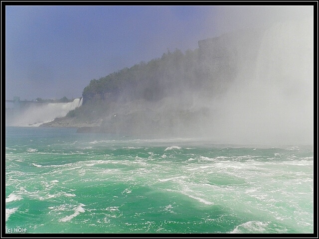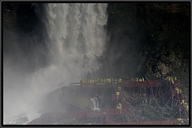 Der Captain erzählt über Lautsprecher so einiges an Wissenswerten Informationen über die Waserfälle, ich höre aber nicht wirklich zu sondern bin eher damit beschäftigt gefühlte zwei Millionen Fotos zu machen - hinterher empfinde ich es trotzdem als zu wenig ...  :bang: ... Vorbei an den American Falls hat man - vermutlich dank der Windrichtung heute - eine gute Sicht auf die Holzplanken der "Cave of the Winds", es ist schon recht beeindruckend wenn man die eigentlich gar nicht mal so hohen Wasserfälle und dann die kleinen Menschen daneben sieht.