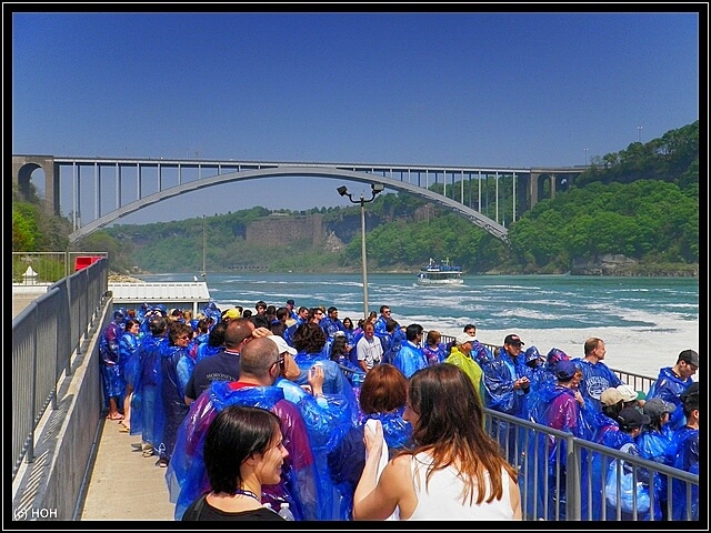 Im angrenzenden kleinen Queen Victoria Park machen wir kurz Pause, da mittlerweile die Sonne von einem strahlend blauen Himmel scheint beschließen wir (oder besser gesagt ICH, weil wir uns nicht sicher waren ob das mit Fin überhaupt klappen würde, hat Danielle in der Zwischenzeit den Souvenir-Shop unsicher gemacht) die Fahrt mit der Maid of the Mist in Angriff zu nehmen. Die ersten Meter hinterm Kassenhäuschen gehen recht flott, mit einem Aufzug fährt man einige Meter tiefer und bekommt den obligatorischen blauen Regenponcho den man auf Bildern schon so oft gesehen hat.