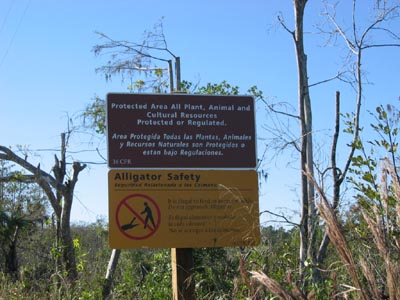 Der nächste Tag ist wiederum schön. Vorgesehen ist ein Besuch des Corkscrew Swamp, der uns als besonders artenreich mit Vögeln, Schmetterlingen etc. geschildert worden war. Wir sind auch früh los, dank dem Navi haben wir den Park auch schnell gefunden, obwohl man doch länger fährt, als ich erwartet habe. Außer unserem Auto waren nur wenige andere auf dem Parkplatz, wir entrichten den Eintritt und los geht’s. Am Anfang des Trails ist eine Tafel, auf der die zu sehenden Tiere aufgelistet sind, und der Besucher soll beim Verlassen angeben, was er gesehen hat.