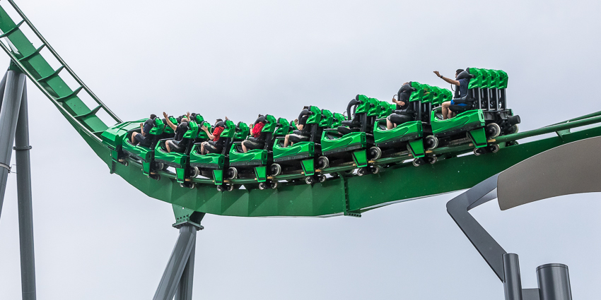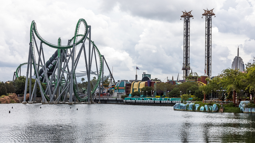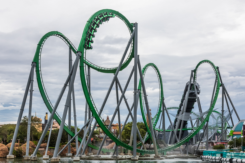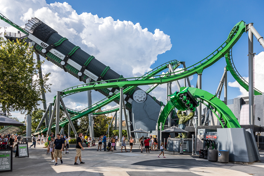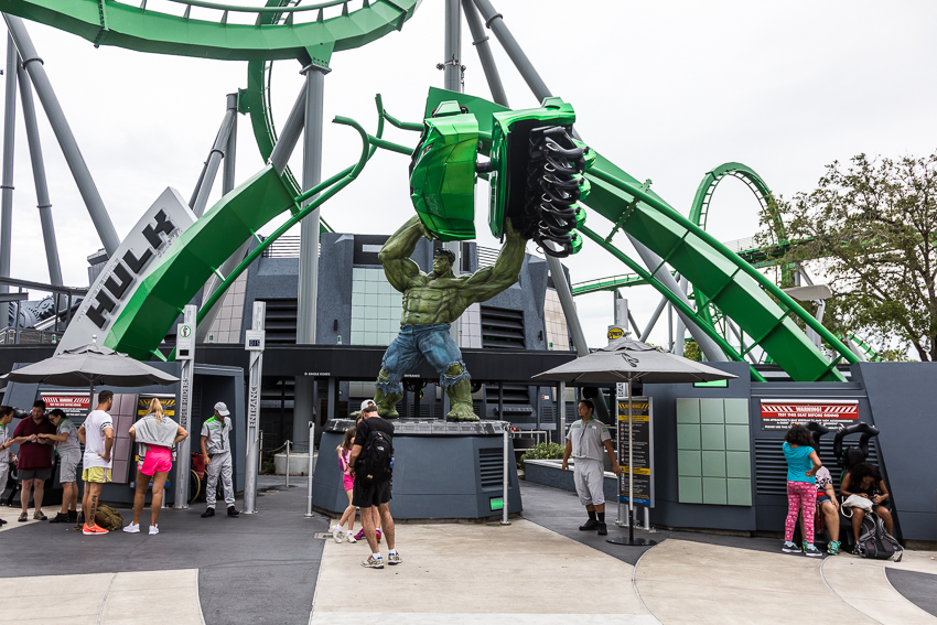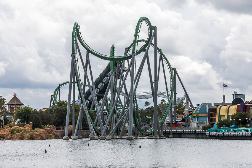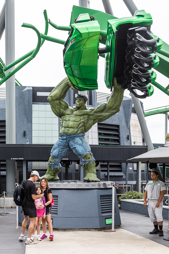 Marvel Super Hero Islanddem Highlight in den „Island’s of Adventure“. Hier gab es die meisten Thrill- Rides - und auf die war gerade Tom ganz scharf. Wir begannen mit „The Amazing Adventures of Spiderman“, ein 3D Thrill- Ride, der selbst nach fast 20 Jahren noch immer „State of the Art“ ist. Weiter ging es zu „Storm Force Accelatron“, hier wurde man in sich selbst drehenden - ich nenne es mal - Suppenschüsseln wild umher gewirbelt. Dabei verlor Paul unglücklicherweise seinen „Express Pass“, den Tom dann aber beim Aussteigen glücklicherweise irgendwo am Boden des Karussell’s wieder entdeckte. Als nächstes machten Birgit, Tom und ich den „Dr. Dooms Fearfall“, zwei Freifalltüme, bei denen einem im buchstäblichen Sinne das Herz in die Hose rutscht. Kurz aber heftig. Zu guter letzt dann das eigentliche Highlight - der „The Incredible Hulk Coaster“. Ein paar Zahlen zu dem 2016 komplett neu eröffneten ( weil rundum erneuert ) Monster: