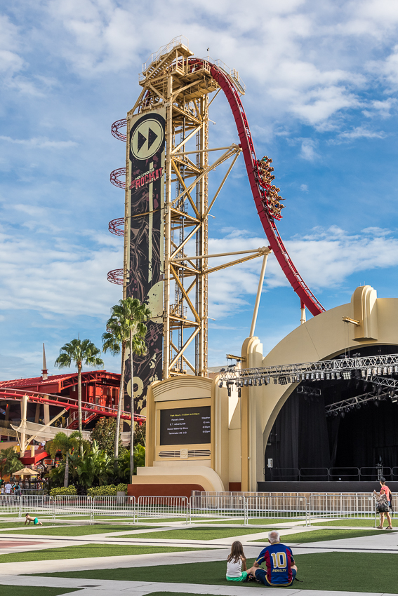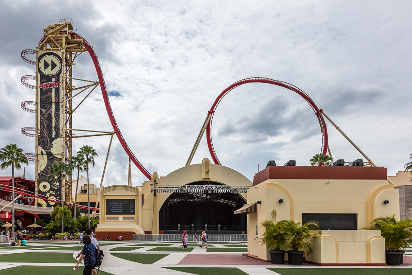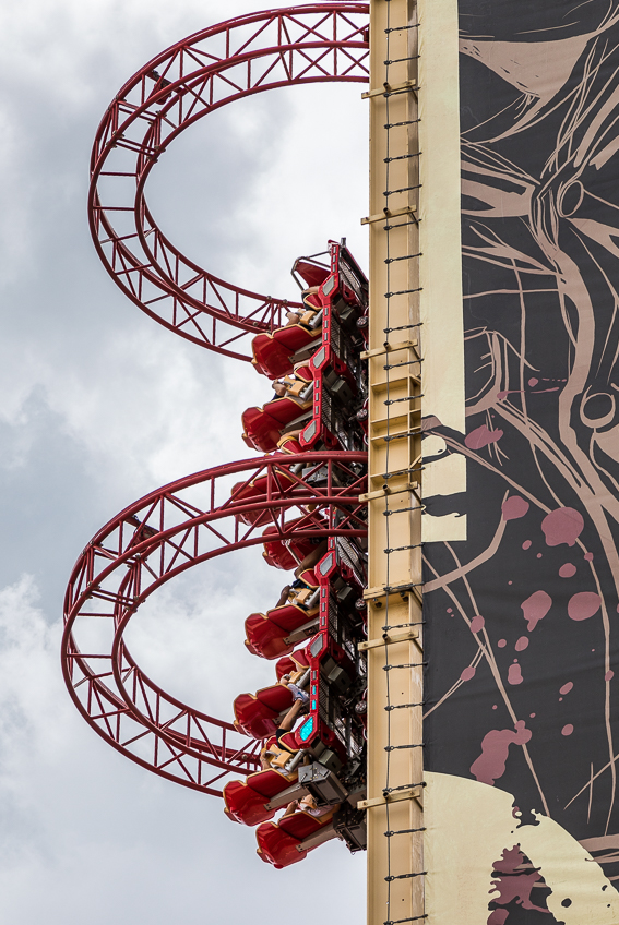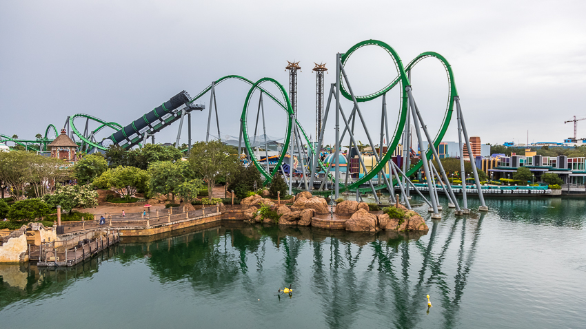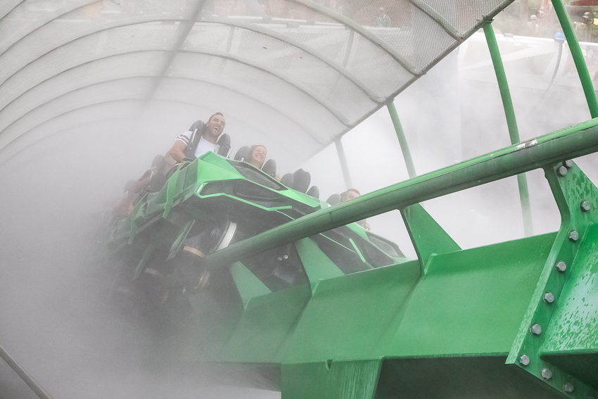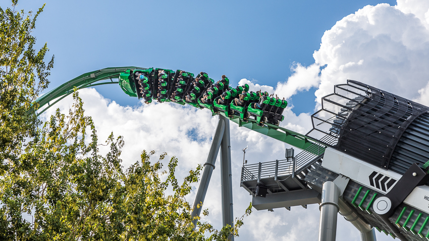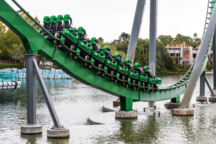 Marvel Super Hero Islanddem Highlight in den „Island’s of Adventure“. Hier gab es die meisten Thrill- Rides - und auf die war gerade Tom ganz scharf. Wir begannen mit „The Amazing Adventures of Spiderman“, ein 3D Thrill- Ride, der selbst nach fast 20 Jahren noch immer „State of the Art“ ist. Weiter ging es zu „Storm Force Accelatron“, hier wurde man in sich selbst drehenden - ich nenne es mal - Suppenschüsseln wild umher gewirbelt. Dabei verlor Paul unglücklicherweise seinen „Express Pass“, den Tom dann aber beim Aussteigen glücklicherweise irgendwo am Boden des Karussell’s wieder entdeckte. Als nächstes machten Birgit, Tom und ich den „Dr. Dooms Fearfall“, zwei Freifalltüme, bei denen einem im buchstäblichen Sinne das Herz in die Hose rutscht. Kurz aber heftig. Zu guter letzt dann das eigentliche Highlight - der „The Incredible Hulk Coaster“. Ein paar Zahlen zu dem 2016 komplett neu eröffneten ( weil rundum erneuert ) Monster:
