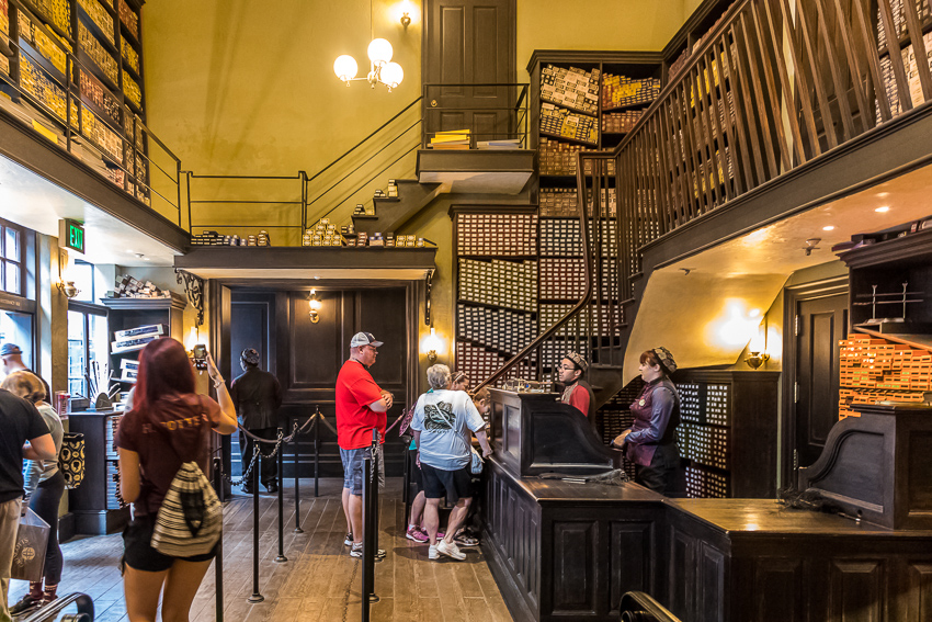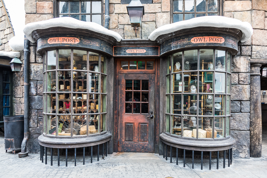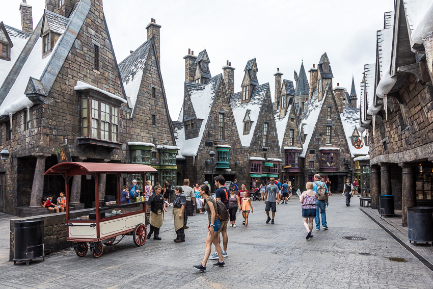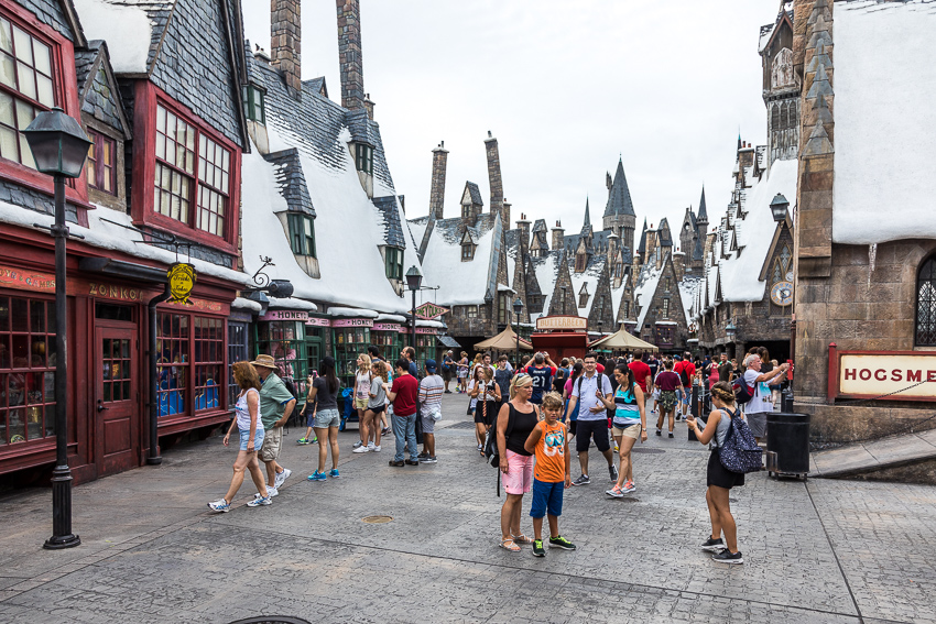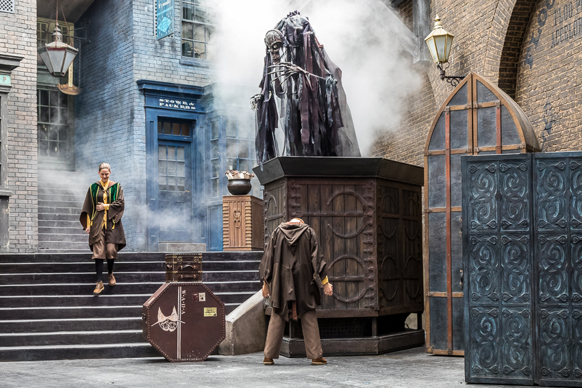 The Wizarding World of Harry Potter - HogsmeadeIn Hogsmeade angekommen tauchten wir in eine Winter-Wunderlandschaft ein. Alles war mit Schnee bedeckt und das schaute auch durchaus überzeugend aus. Als erstes schauten wir uns bei „Ollivanders“ an, wie für ein kleines Mädchen aus dem Publikum der passende Zauberstab ausgesucht wurde. Und auch auf die Gefahr das ich mich wiederhole: wie alles andere in der Harry Potter Themenwelt war das Ganze einfach nur klasse umgesetzt. Auch der Schauspieler der den Ladenbesitzer „Ollivanders“ spielte war mit vollem Elan dabei. Danach ging es weiter zu „Hogwarts Castle“ Dort befand sich der Thrill- Ride „Harry Potter and the fortbidden Journey“. Und der Wahnsinn steigerte sich noch. Mit Hilfe von Kuka- Robotern, bekannt aus der Automobilindustrie, wurde der Ritt auf einem Zauberbesen simuliert. Nachdem auch dies überstanden war, fuhren Tom und Paul noch den kleinen Coaster „Flight of the Hippogriff“. Gegen den Uhrzeigersinn gingen wir nun weiter zu: