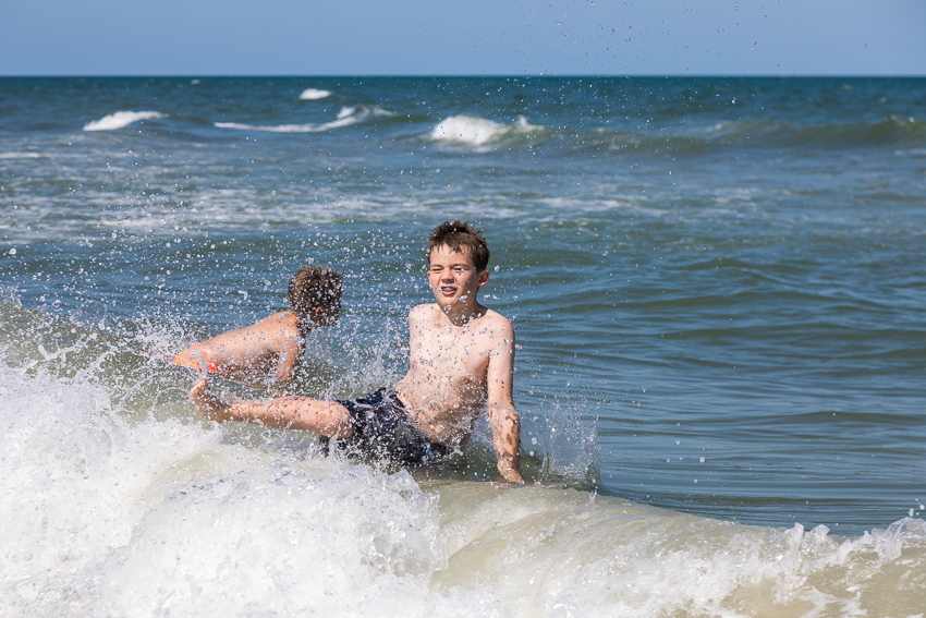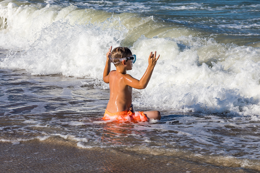 Dann ging es weiter an den ca. 200m entfernten und zu Fuß gut erreichbaren Strand. Dieser war sehr breit und verfügte über relativ hellen Sand. Die Wellen waren schön groß und so hatten wir alle einen Riesen Spaß. Gut, Birgit verlor zwischendurch aufgrund einer großen Welle ihre Sonnenbrille, aber ansonsten war alles super. Um kurz nach halb sieben mussten wir Tom und Paul dann mehr oder weniger mit Waffengewalt dazu überreden, den Strand zu verlassen.